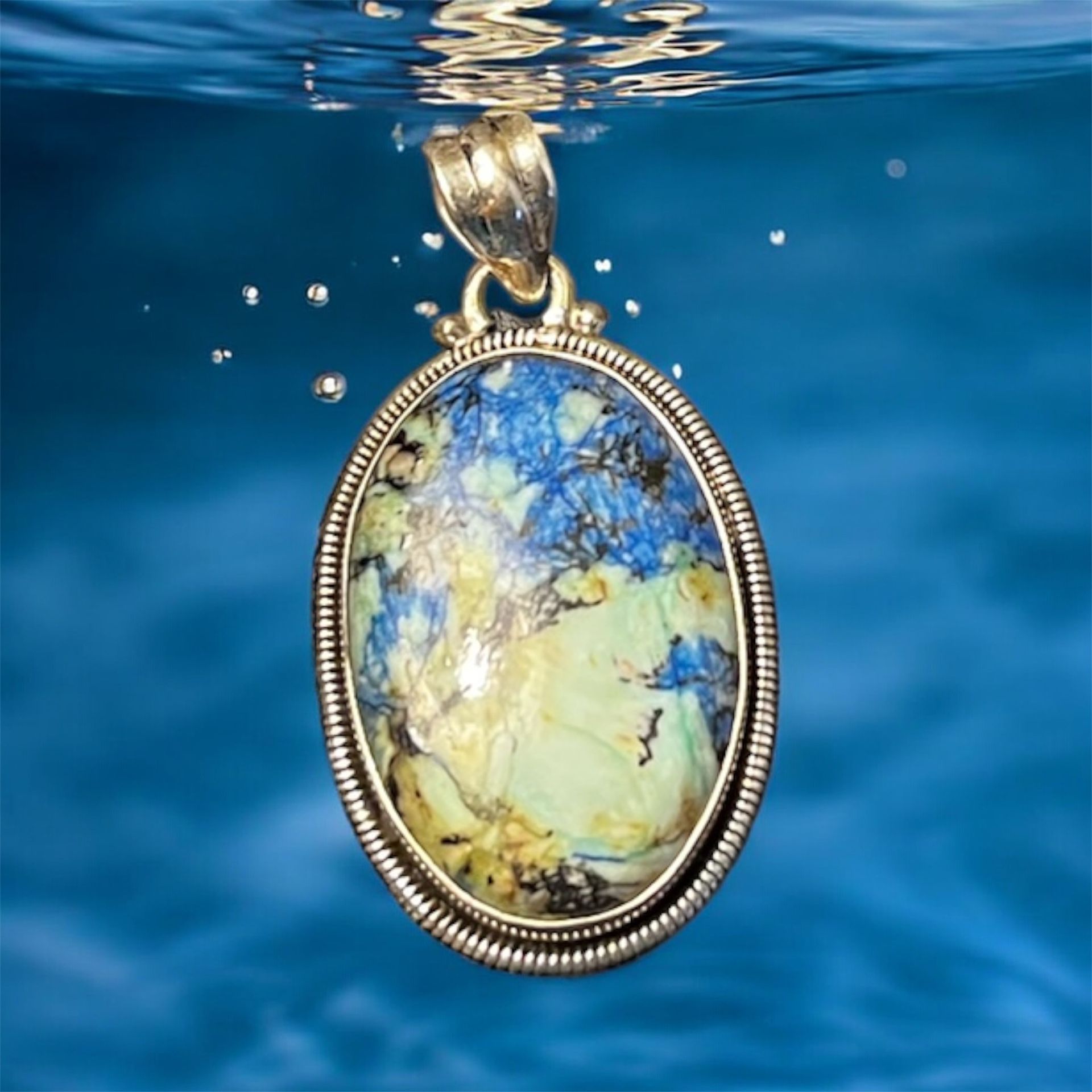 This lovely oval pendant is handmade of deep colorful blue azurite which can have many different shades of blue. Azurite has many spiritual uses and properties including: * Meaning: Azurite, often referred to as the Stone of Heaven, is a soft, prismatic crystal known for its vibrant blue color, and it symbolizes inner strength and emotional balance. * Healing Properties: This crystal is celebrated for its ability to remove physical and emotional blockages, enhance cellular repair, promote oxygen flow through the body and brain, and potentially aid in treating degenerative disorders and alleviating migraines. * Protection: Azurite is believed to act as a shield by clearing away tension and confusion, providing mental clarity and protection against negative energies and emotional stress. * Usage: Azurite can be utilized in various forms such as jewelry, placed in home and office for Feng Shui practices, and used in meditation spaces to enhance spiritual connection, communication, and creativity. Azurite is considered uncommon rather than rare because it forms under specific conditions and readily alters into malachite. Its high degree of instability in the presence of heat, light, and air causes it to weather and change, making large, gem-quality crystals that hold their color and form very difficult to find and preserve. Azurite is a traditional birthstone for May and is the zodiac birthstone for Sagittarius. It is also considered a natural birthstone for those born between February 19 and March 19, the period surrounding the vernal equinox. Azurite is associated with the Third Eye, Crown, and Throat chakras. It is used to enhance intuition, spiritual insight, and mental clarity by stimulating the Third Eye chakra, while also opening the Crown chakra for a higher connection and the Throat chakra for clear communication of experiences. Third Eye Chakra * Function: Associated with intuition, psychic abilities, and inner vision. * Azurite's role: Helps to clear mental clutter and open the mind to new perspectives and deeper spiritual insight. Crown Chakra * Function: Connected to higher consciousness, spiritual awareness, and enlightenment. * Azurite's role: Promotes spiritual growth and helps align one with their highest self. Throat Chakra * Function: Responsible for communication, self-expression, and speaking your truth. * Azurite's role: Clears the throat chakra to help with the verbalization of experiences, such as those from dream work or astral travel.