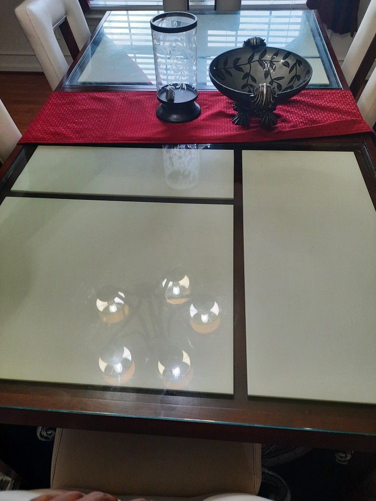 This is a beautiful dining set with 6 chairs and thick glass table top. Easy to clean.