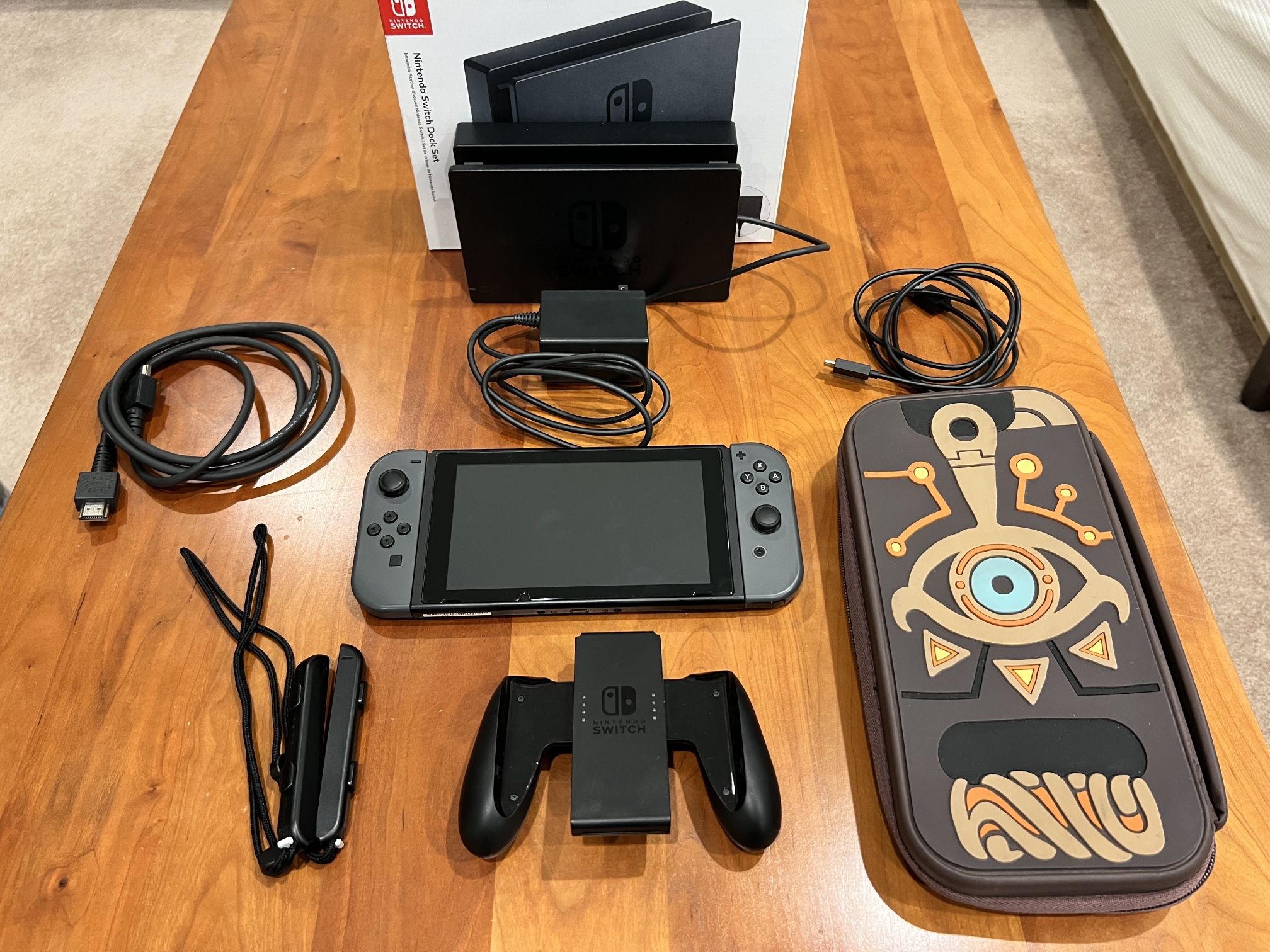 Includes: - Nintendo Switch Console - 128 GB MicroSD Card - Nintendo Switch Dock - Nintendo Switch Charging Cable - Nintendo Switch HDMI Cable - JoyCon Controller Grip - Nintendo Switch Controller Grip - Limited Edition Legend of Zelda Case