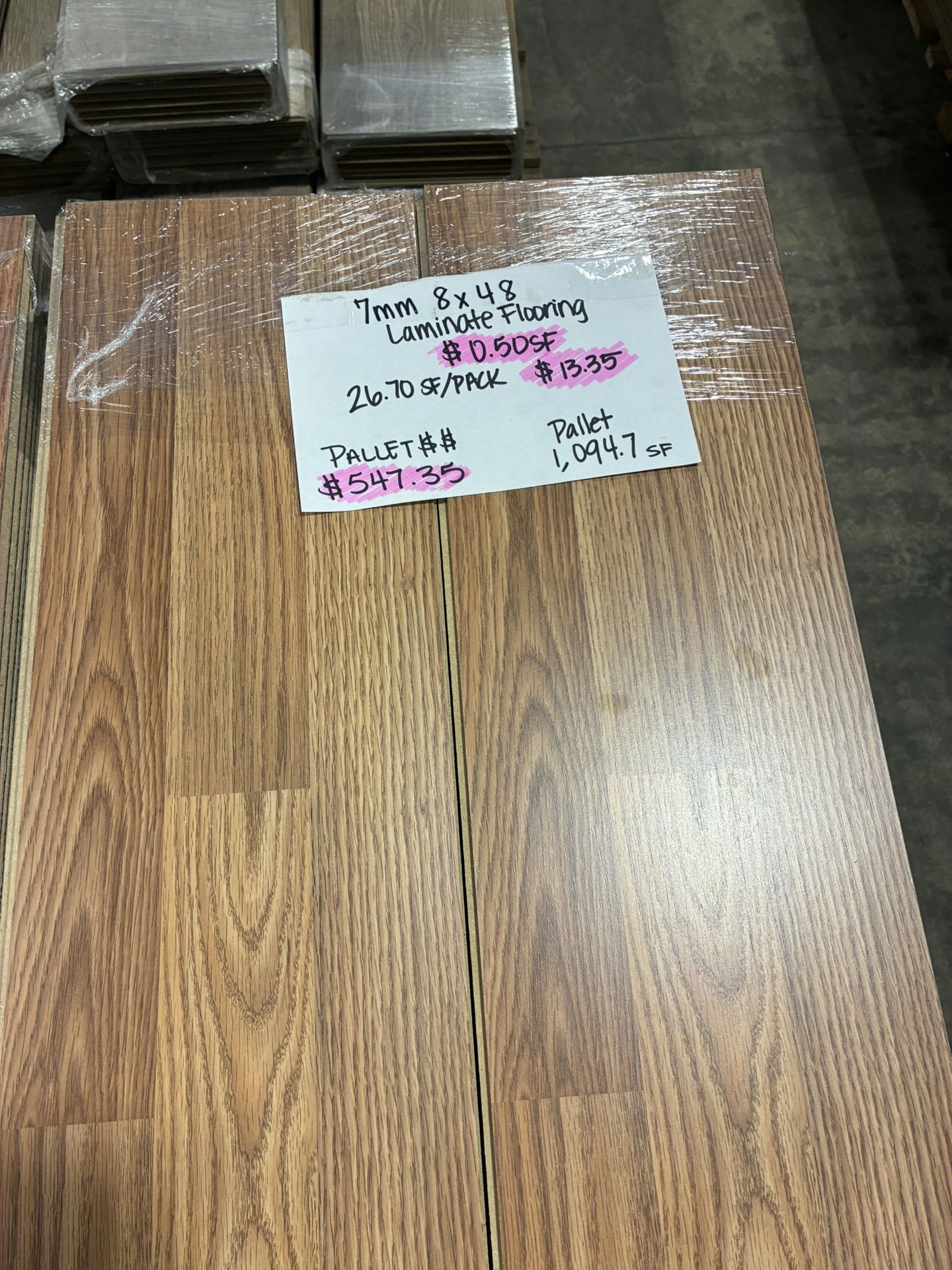 See photos for color of flooring and pallet price 7mm 8x48 laminate flooring click lock water resistant no attached pad. 26.7 sq ft package $13.35 package plus tax All sales final Our pricing is firm.