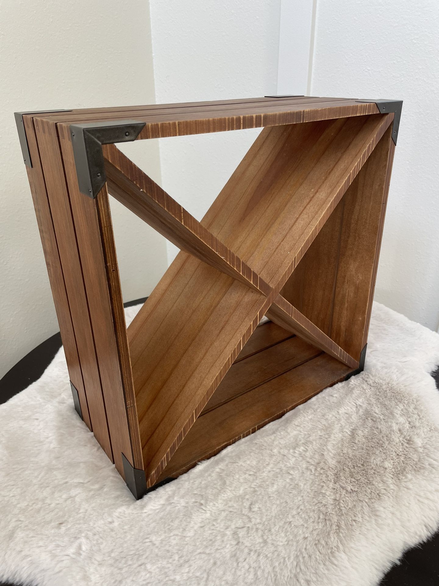 Compact Cellar Cube Wine Rack. Corners have metal accents. Dimensions 15.25x15.25x 7.5”. Rack is in great shape.