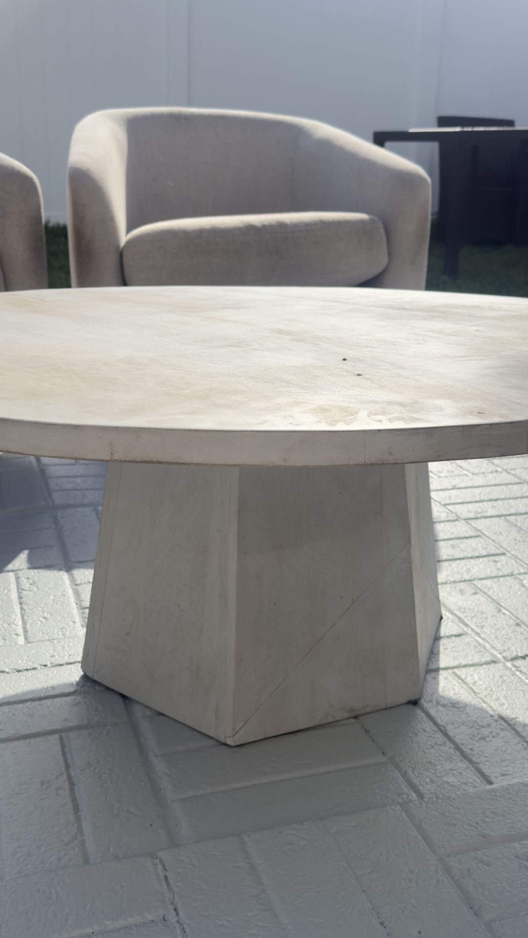 This coffee table is SOLID wood not pressed wood. Beautiful versatile and sleek / clean look can be combined with many different design styles
