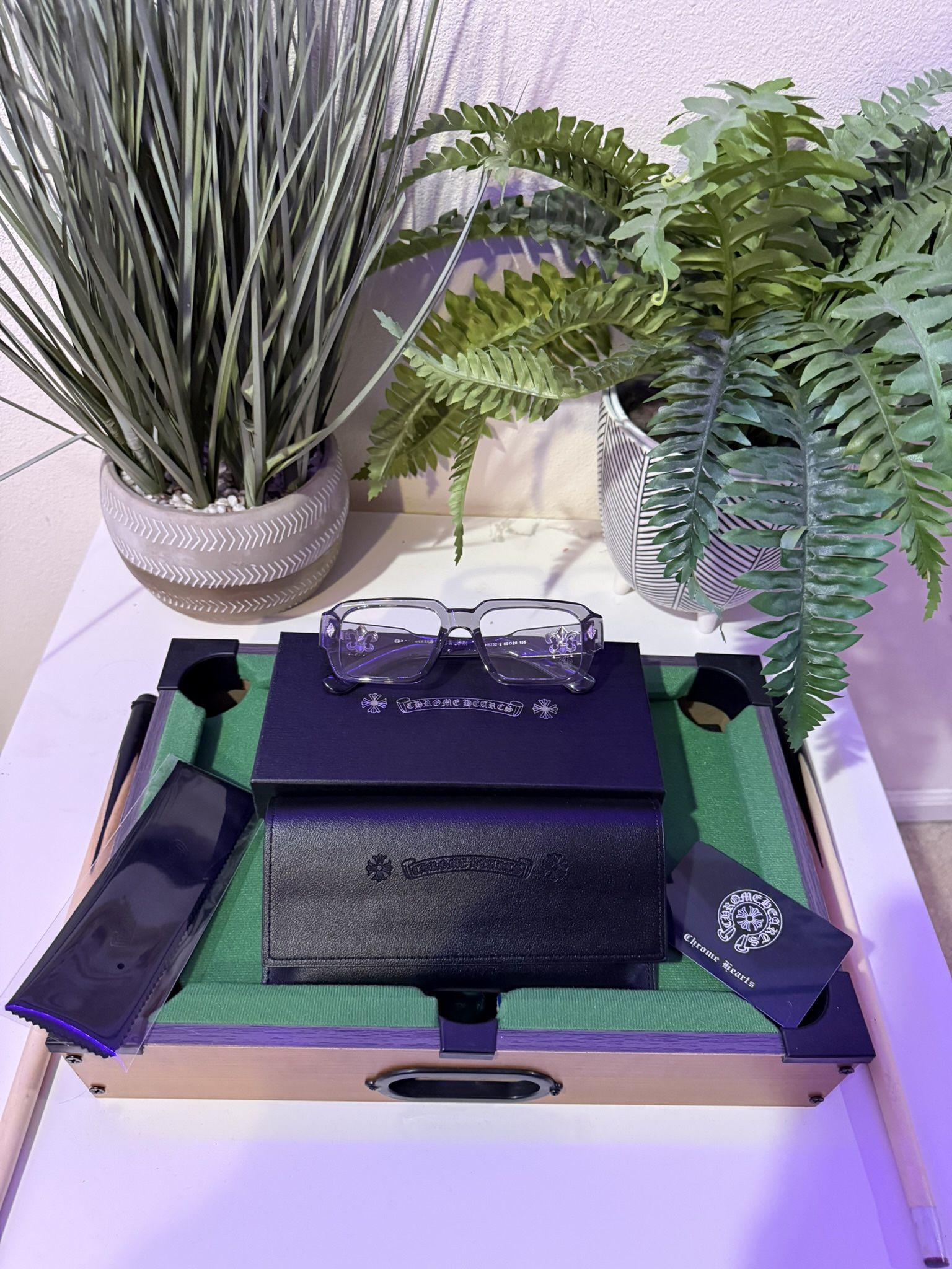 Brand new Chrome Hearts clear frame glasses. These feature the iconic Chrome Hearts silver fleur-de-lis hardware on the temples with a bold, high-end design. Extremely rare and hard to find in this condition. Condition: Brand new in the box with everything. Comes with original Chrome Hearts packaging, including: ✔ Chrome Hearts leather case ✔ Authenticity card ✔ Cleaning cloth These can be worn as fashion frames or fitted with prescription lenses at any optician. Details: • Authentic Chrome Hearts • Clear acetate frame • Sterling silver hardware details • Luxury handmade quality • Unisex style Retail on Chrome Hearts eyewear is very high and availability is limited—don’t miss out on this incredible quality on this one to one product. Pickup/Shipping: shipping available at buyer’s expense. Cash, Apple Pay, or Venmo accepted. Message me for more photos or details.