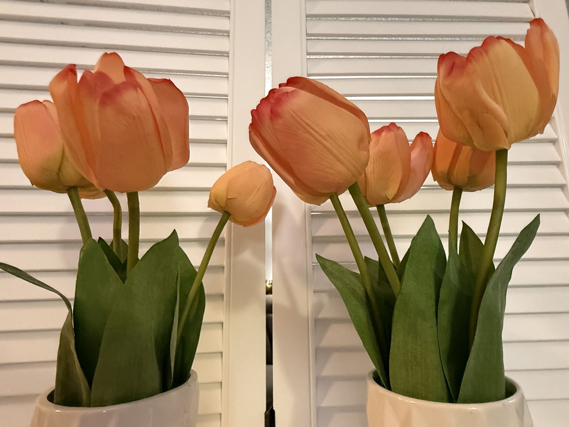 Used 2 Pcs Tulips Artificial Flowers with White Ceramic Vase Faux Pink Flowers Tulips Originally 16.99 each. Preowned just a bit dusty from storing. Planters are very nice too. About 18” tall 6-7 diameter See photo description condition PICK UP SAHARA NELLIS AREA
