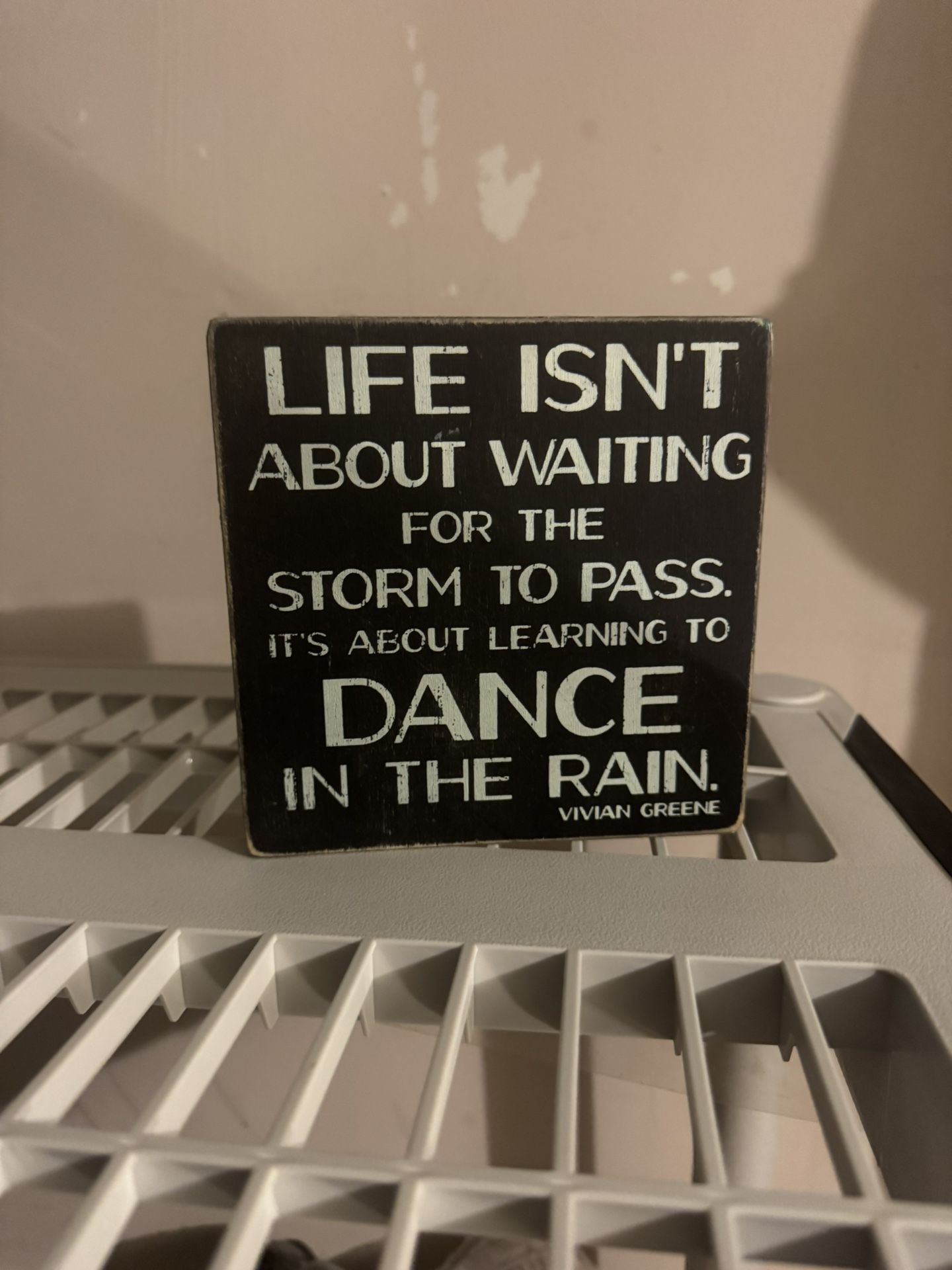 I'm selling a decorative wooden box sign that says, "Life isn't about waiting for the storm to pass. It's about learning to dance in the rain." It has a black background with white lettering. The sides have a white polka dot pattern on a black background