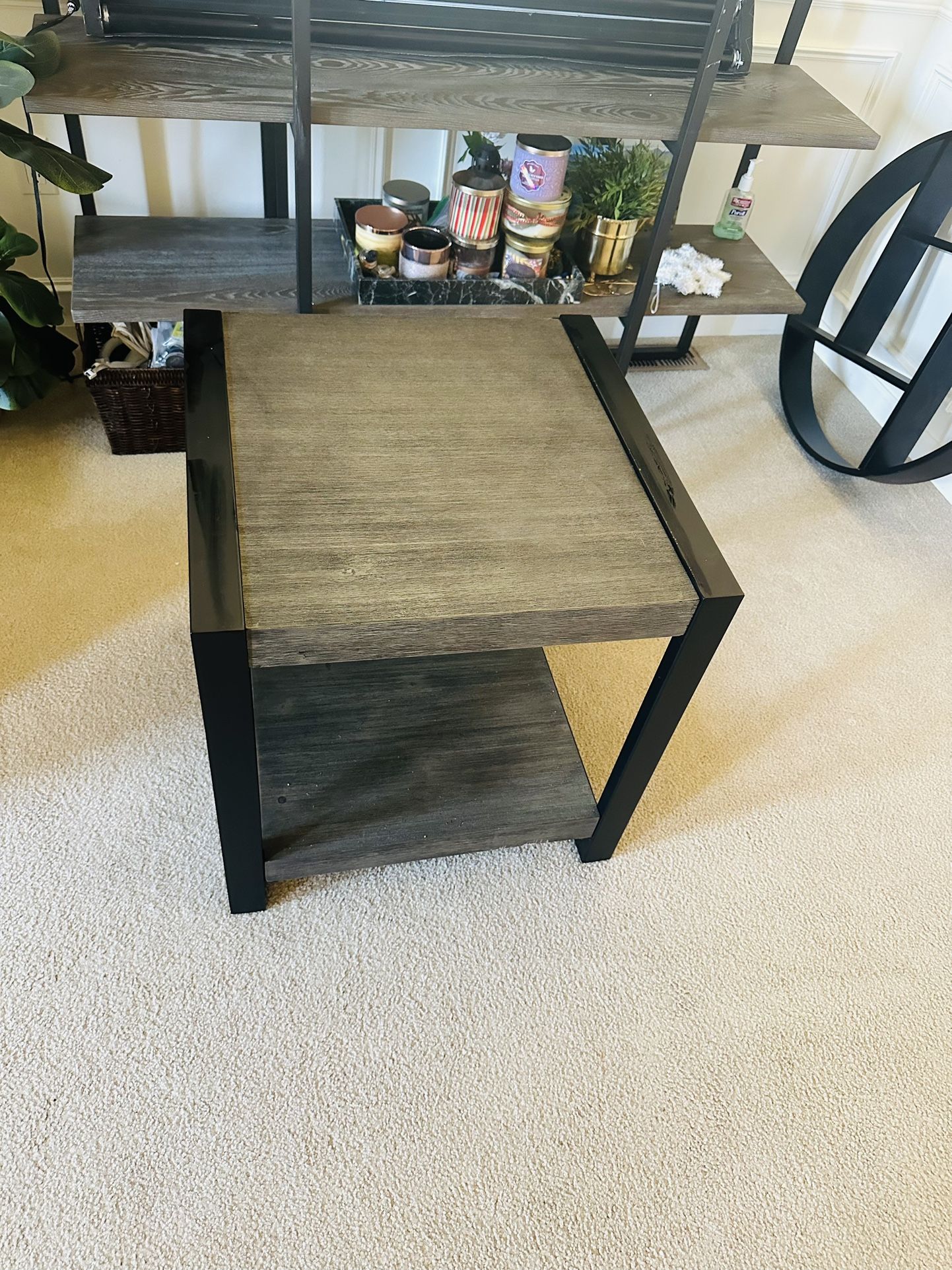 Black metal, grey wood furniture End Table. H 24in x L 23in x W 23in Can be used for pictures, books, sentimental items and souvenirs and more!