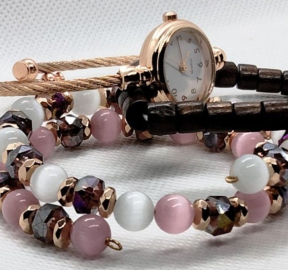 Sparkling Crystals, Wood and Red Gold Color Watch Bracelet Set of 3.
