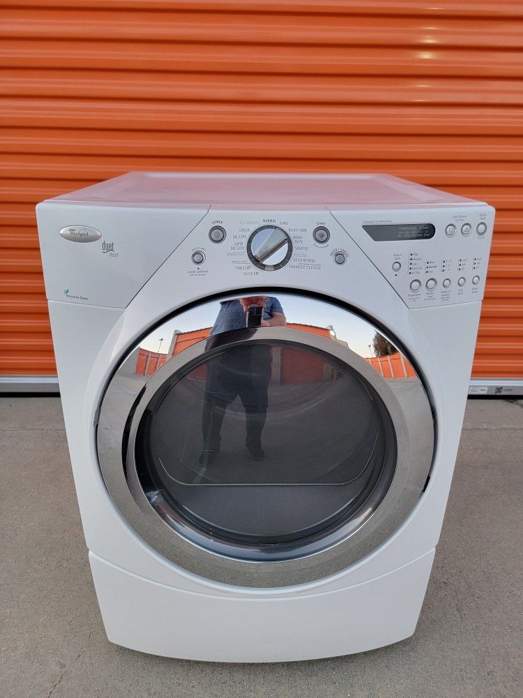 Like New!!! Top Of The Line!!! Whirlpool Duet, STEAM, Gas Dryer with Huge, 7.4 Cubic Ft. Capacity!!! Must See To Appreciate!!! Like New Condition!!! Whirlpool Duet, STEAM, Gas Dryer!!! Huge 7.4 Cubic Ft. Capacity!!! Interior Drum Is Like Brand New!!! It Works Perfectly!!! It Has a Plethora of Great Drying Cycles and Options!! It Has 5 Temperature Settings!!! High Medium Low Extra Low Air Only Dryness: More Normal Less Has Wrinkle Shield!!! Has Reduce Static!!! Drys Very Fast!!! Has End Of Cycle Signal!!! Must See To Appreciate!!! Local Delivery $25.00 - $35.00 (Longer Distances, Extra). Please Ask For A Quote.