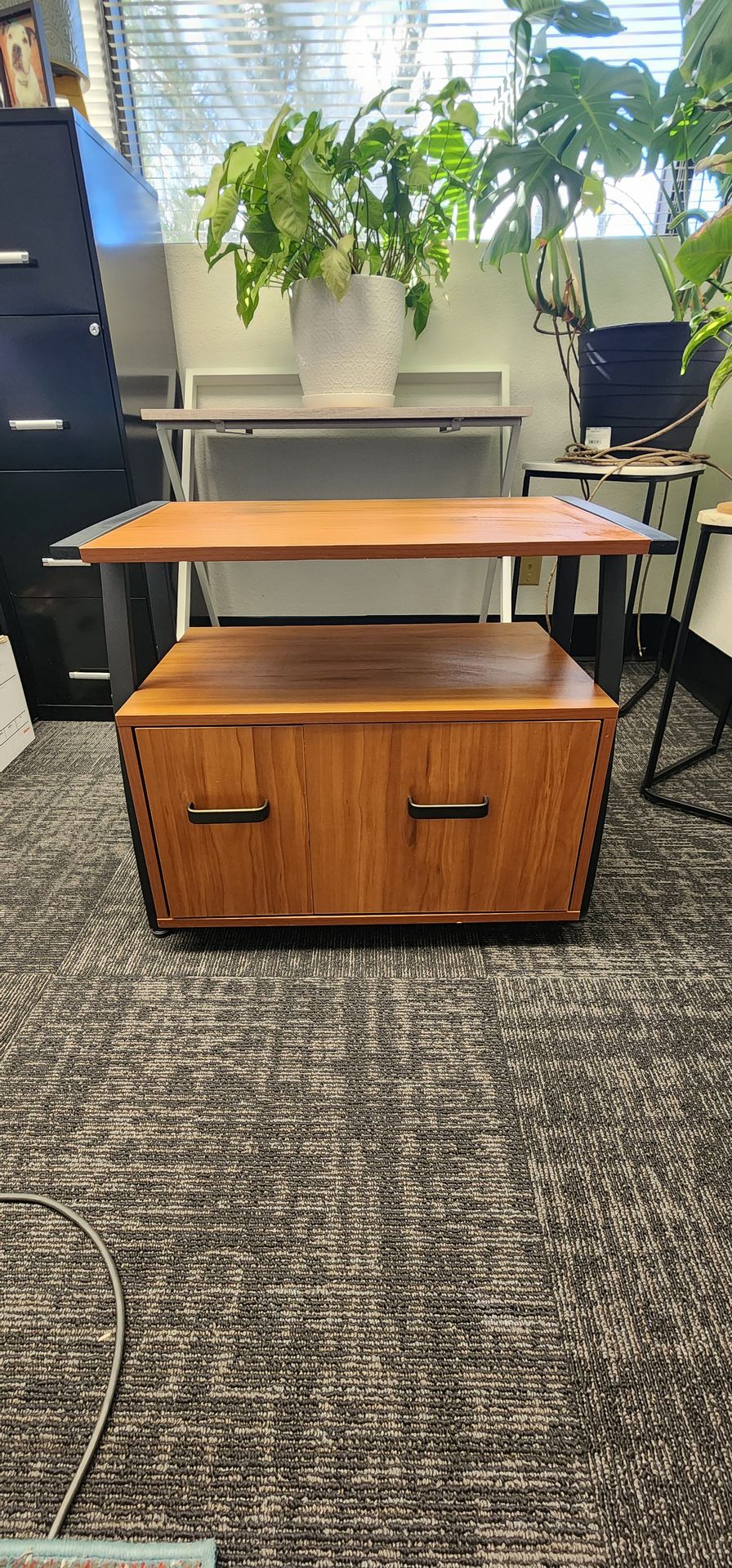 Printer stand with shelf, cabinet and hanging file drawer that fits standard sized files. Measures 22.5 inches high, 26 inches wide and 15.5 inches deep. Shelf opening is just under 7 inches high. Pickup in Victorville. Used, normal wear but in great condition overall and very sturdy.