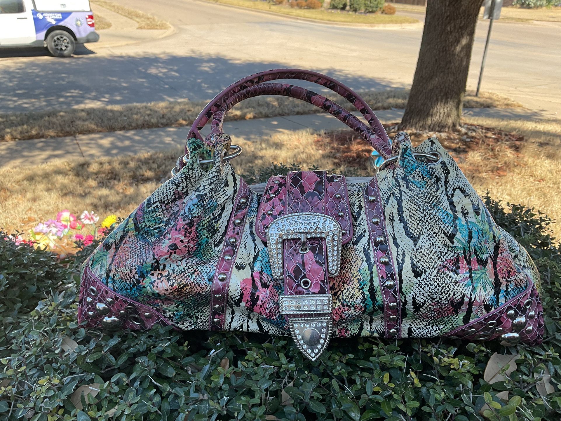 Colorful designer purse with belt buckle, key chain holder on the side of purse, look good on the inside of purse, used once