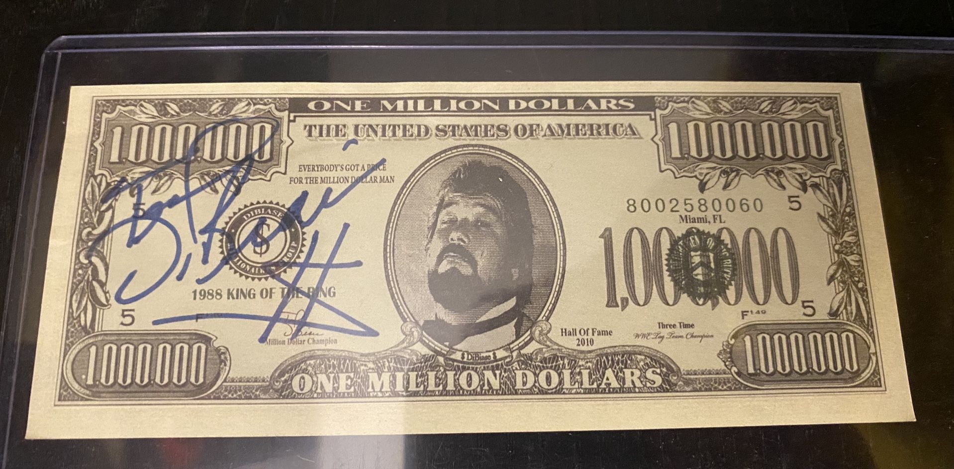 WWF/WWE Hall of Fame inductee “The Million Dollar Man” Ted Dibiase signed Million Dollar Bill prop dollar bill.