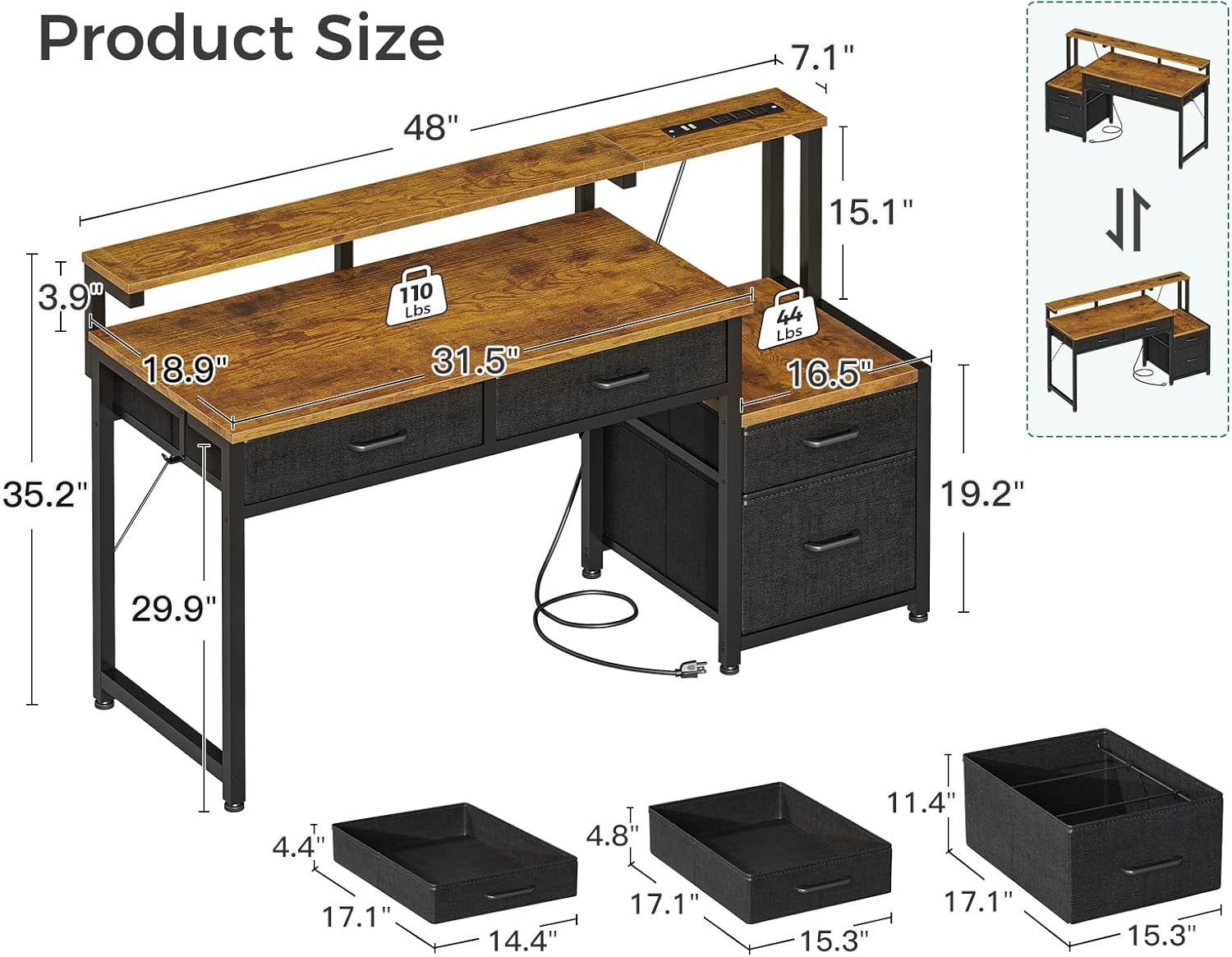 B787 $50 Grey color available Shape Rectangular Desk design Computer Desk Product Dimensions 18.89"D x 48"W x 35.39"H Color Grey Style Modern Spacious Fabric Drawers for Home Office Organization: This computer desk features 1 large drawer designed for A4/letter files and 3 additional drawers for office supplies, helping keep paperwork and essentials neatly organized in a home office. Built-in Power Outlet for Home Office Devices: This office desk includes 3 AC outlets and 2 USB ports built directly into the desk, making it easy to power laptops, monitors, printers, and office accessories in one place. Designed for Small Home Offices: This desk is commonly used as a home office workstation, offering a sturdy surface for dual monitors, documents, and a printer, ideal for remote work and daily office tasks. Raised Monitor Shelf for Better Ergonomics: The monitor shelf is designed to position screens at eye level, helping reduce neck and back strain during long working hours while freeing up main desk space. Printer Shelf with Reversible Left/Right Setup: The printer shelf can be installed on either side, keeping printers or CPUs within reach while maintaining full drawer functionality in small home office layouts.