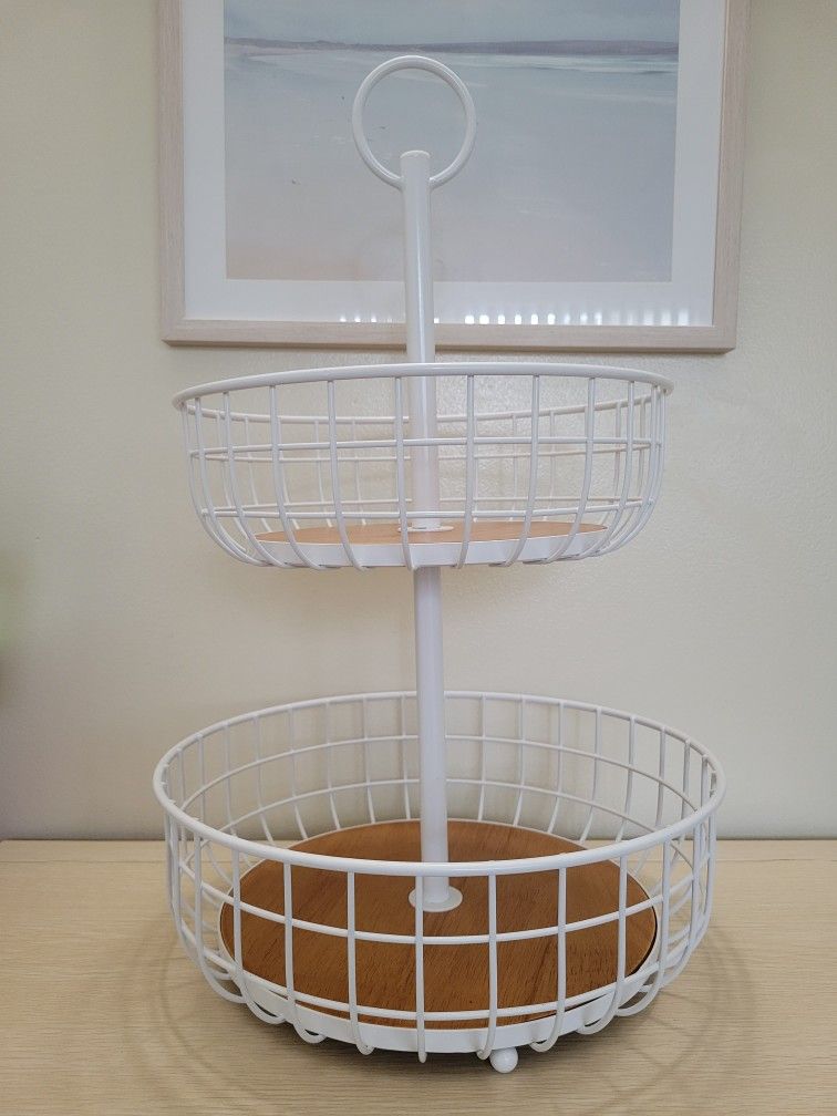 • White Large Two Tier Wire Basket Stand • Great Condition • 2 Baskets for Prep and Serving • Handcrafted Wrought Iron with Durable Finish • Wood Base Prevents Small Items from Falling Through • Easy to assemble • Perfect for kitchen, Bath or Decorative Storage • Food Safe • 15" D x 23.25" H • Pet & Smoke Free Home ✔️