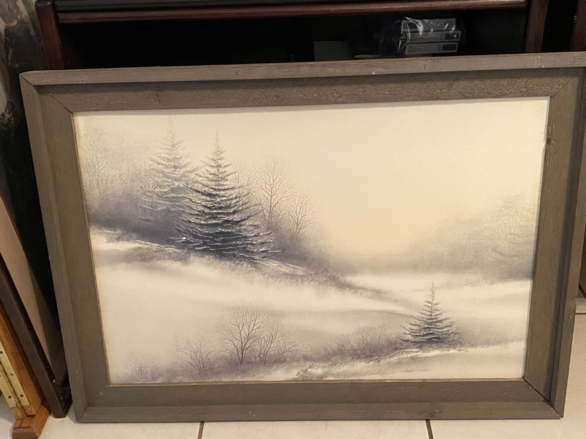 Rustic framed, limited-edition lithograph print titled "Evening Mist" by artist Arnold Alaniz. Approximately 34” wide X 25” high There is a small tear ( image included)