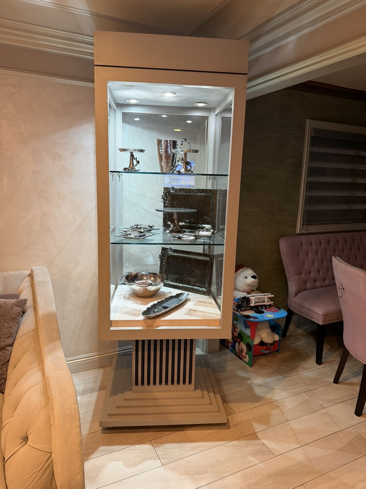 I have a nice stand with wheels. Easy transport with glass shelves and led lighting. Let me know if interested. The vases are not for sale.