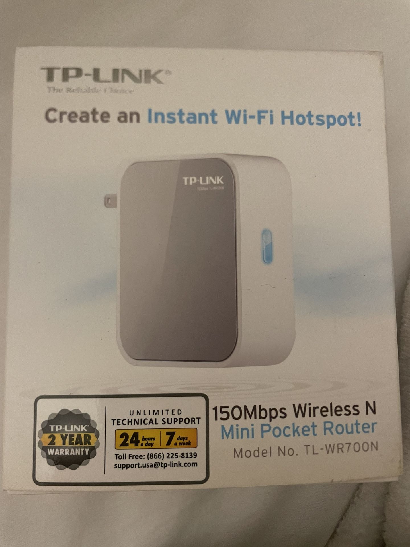 Description: TP-Link TL-WR700N 150Mbps Wireless N Mini Pocket Router. Perfect for travel, hotel rooms, dorms, or extending WiFi at home. Just plug in and create an instant secure WiFi hotspot. Features: • Router Mode (Plug & Play) • Repeater Mode (extend WiFi signal) • Access Point Mode • Bridge Mode • Client Adapter Mode • Compact & portable design