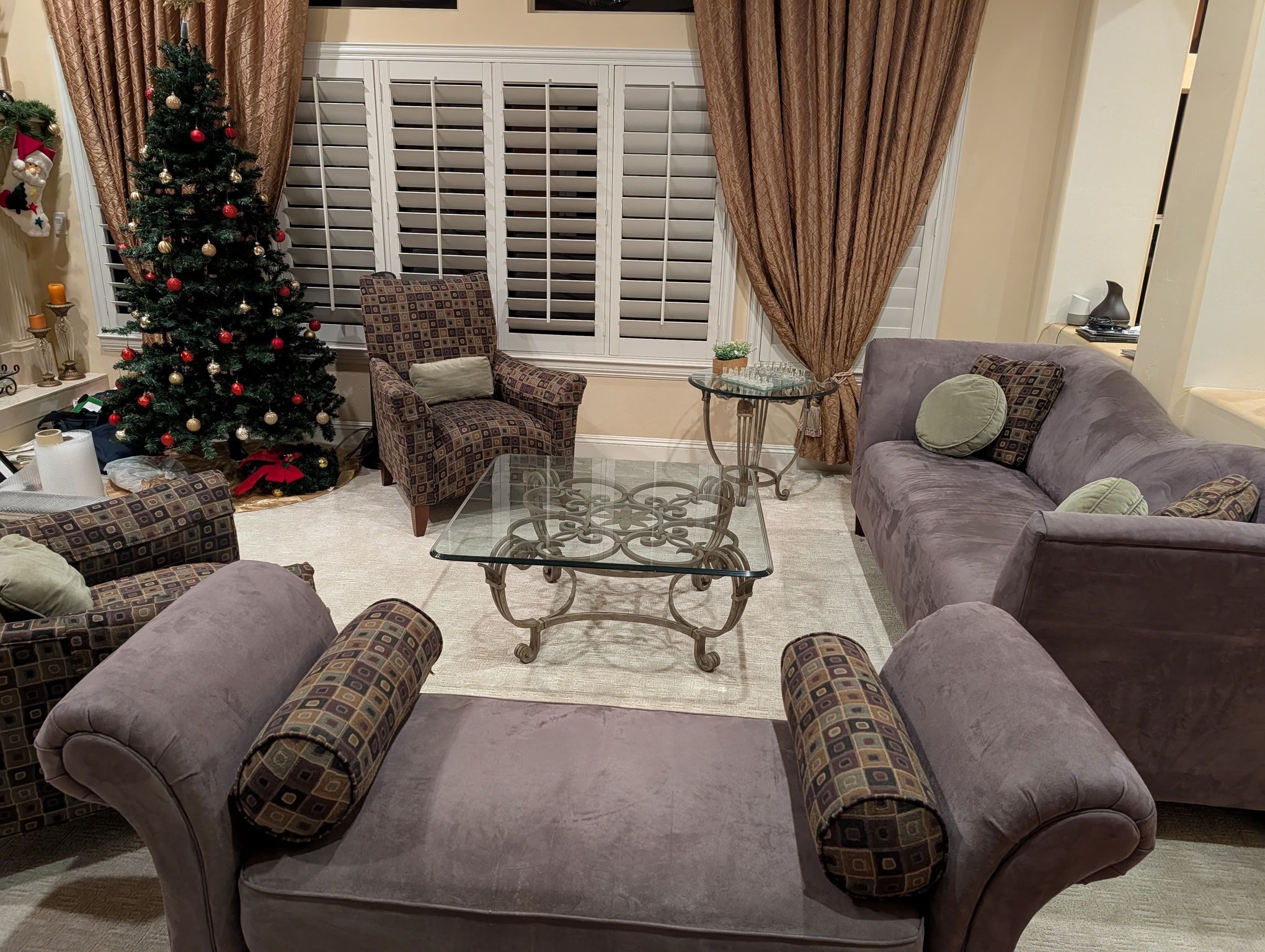 Purple Suede couch chairs Chaise And glass tables