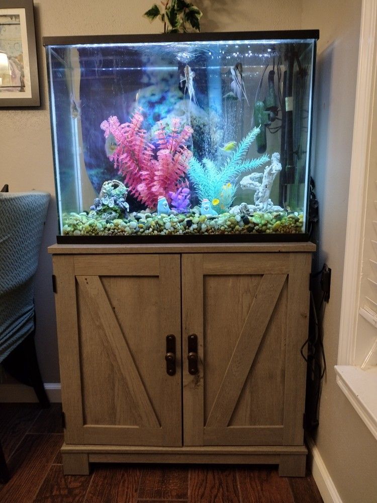 Fish tank and cabinet comes complete with everything you need to start up your new fish tank. Fluval canister filter, 2 air pumps, bubble wall, some media for the canister filter, LED lights, lots of decor, rocks, PH up / PH down, water clarifier, etc.
