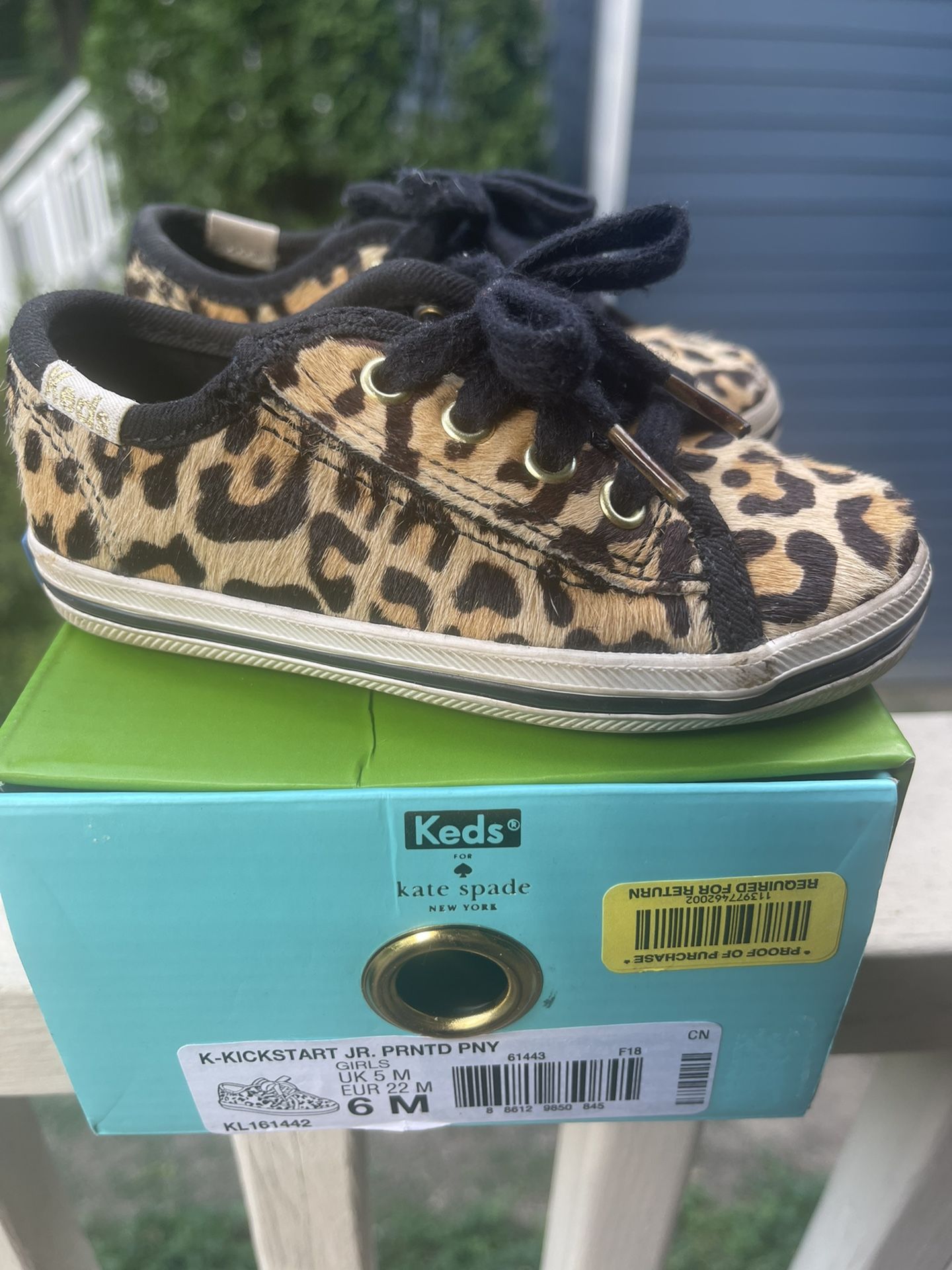 Keds X Kate Spade New York Kickstart Leopard Little Kids Shoes These wildly wearable Kickstart sneakers feature thre major must-haves: animal print, luxe pony hair, and velcro closures (no shoes laces to tie!), making for one seriously adorable pair of shoes. Features: Little Kids Sizes (see pictures for size chart) Kate Spade New York logo & detailing Genuine bovine cow fur from Vietnam, dyed and screen printed in China Soft breathable lining Cushioned insole Flexible, textured rubber outsole Premium kate spade packaging Imported Model/Coor: KL161442