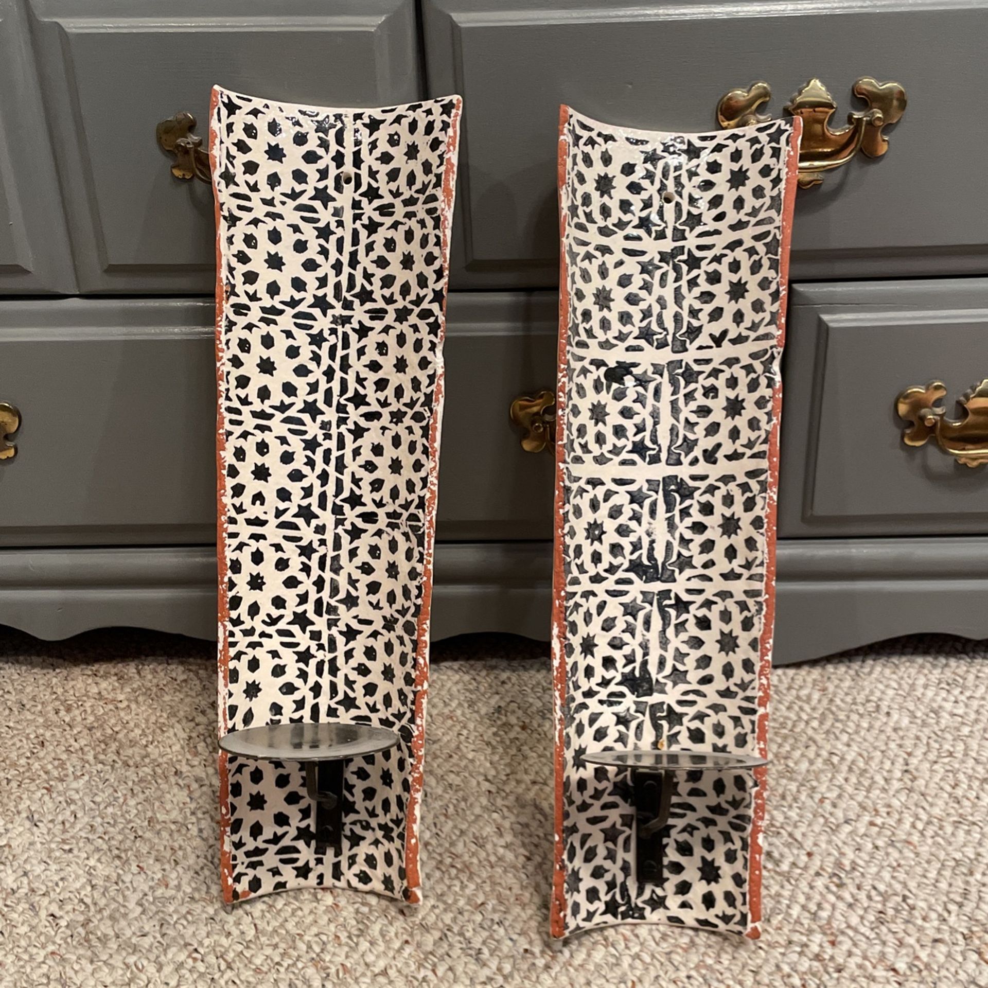 Beautiful ceramic wall sconces. Good condition. White and black pattern on front, selling as a pair.