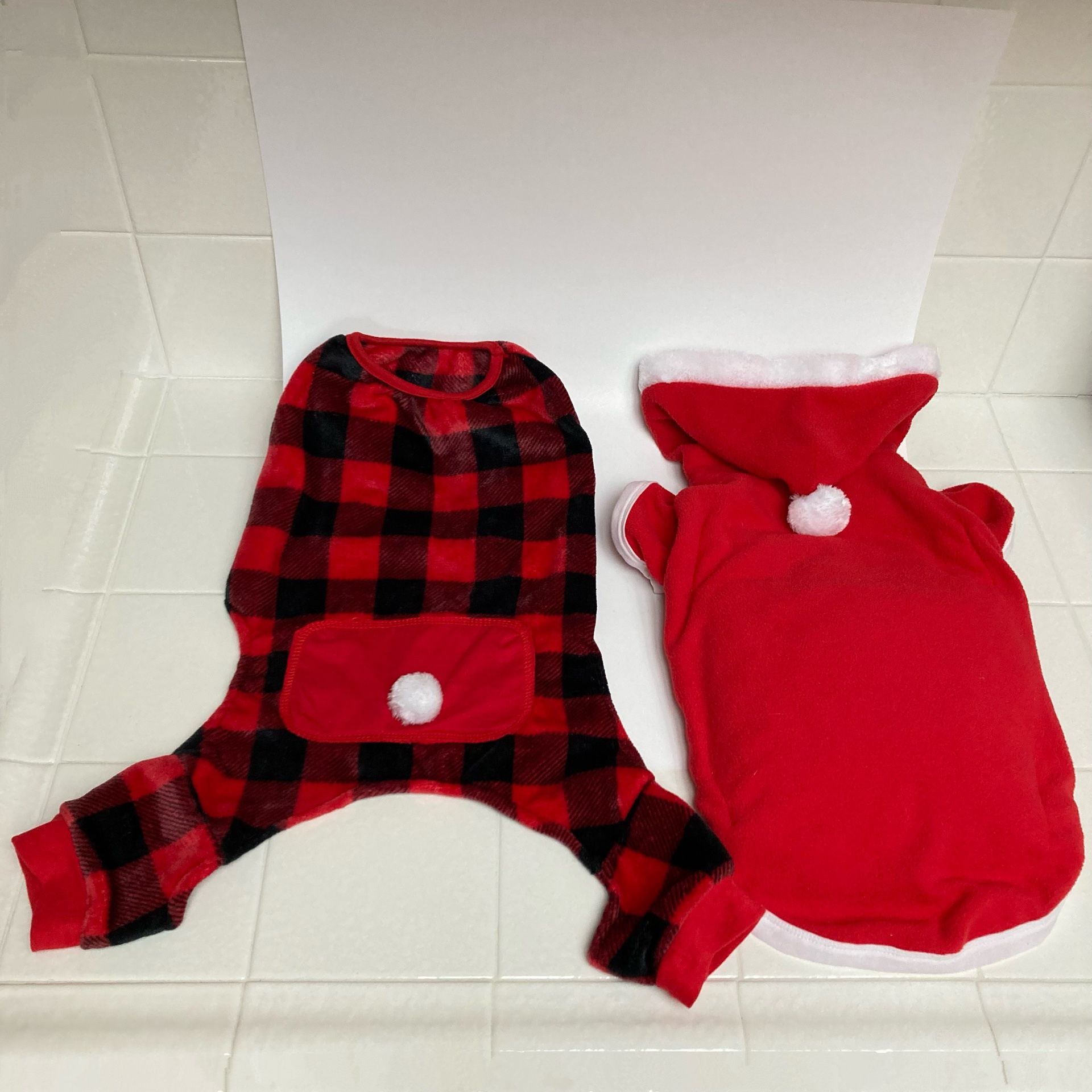 (2) Dog Christmas Costumes Plaid Pajamas: Length: ~16” Circumference (widest point): 24” Santa Coat: Size (M) Velcro closure, padded back, slit for leash connection . Length: ~18” Circumference (widest point): 24”