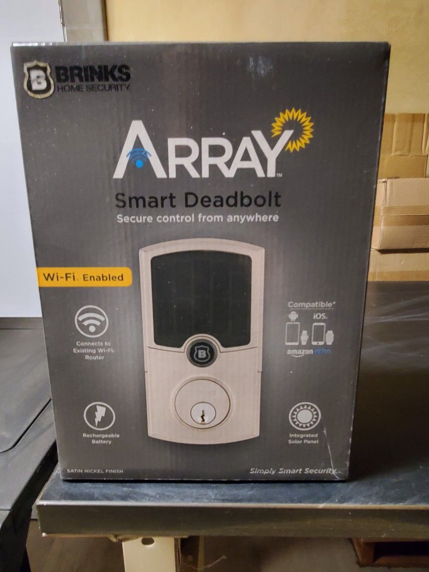 New Brinks Array Smart Deadbolt with Wi-Fi connectivity, rechargeable battery, and integrated solar panel. Compatible with iOS and Amazon Echo. Has a metal keypad and one-touch locking. Includes a high-capacity power system and intuitive mobile app for managing access and activity logs. Plenty available.