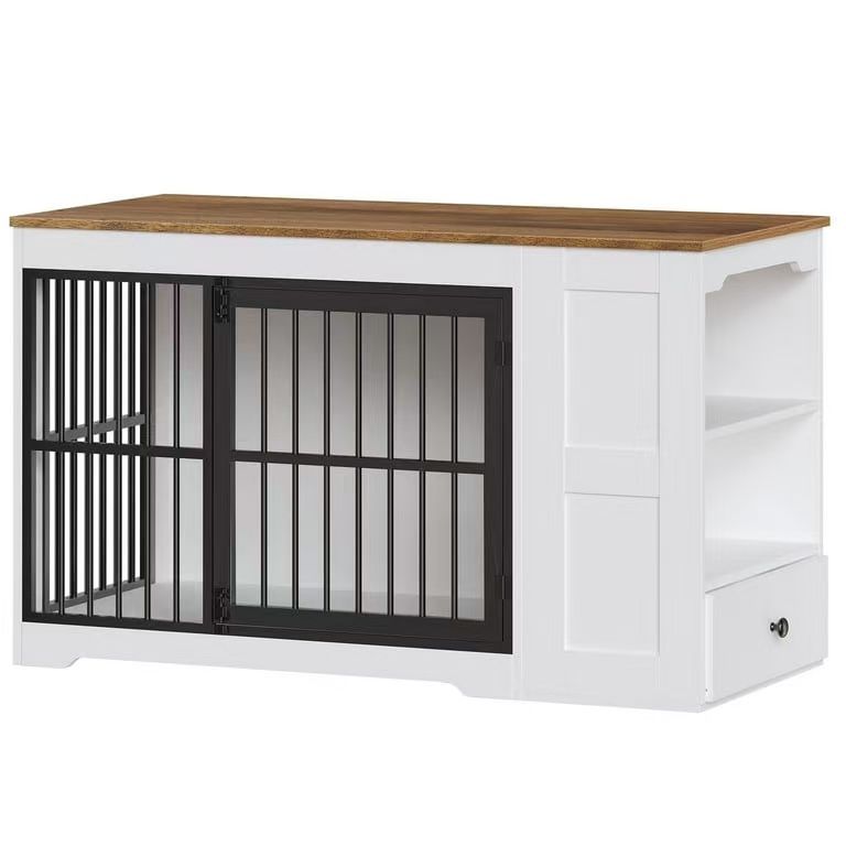 Dog Crate Furniture, 47.2” Dog Kennel Indoor with Storage Shelf and Feeding Bowls, Wooden Dog Kennel Furniture for Medium Large Dogs, White, Walnut and Black $70