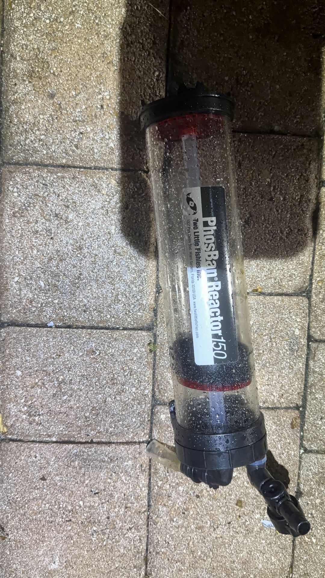 The Two Little Fishies PhosBan Reactor 150 is a chemical filter media reactor that uses the upflow principle to achieve efficient use of the media. It can be mounted hanging on the back of an aquarium or below it. It includes a ball valve for regulating flow and flexible connection fittings that can rotate 180 degrees for a custom fit.