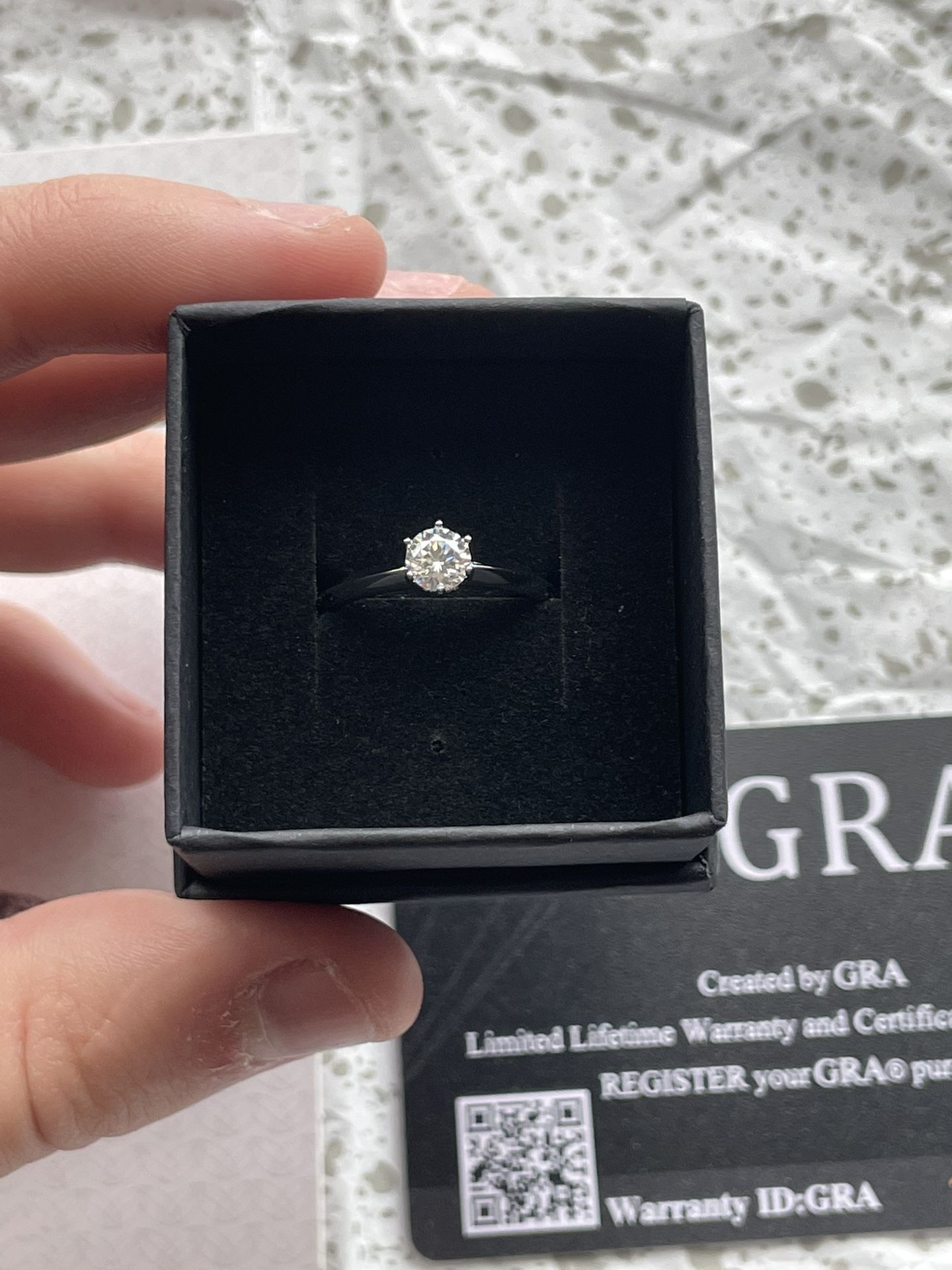 This engagement ring is made of 925 Silver and VVS1 Moissanite and comes with a GRA Certificate.