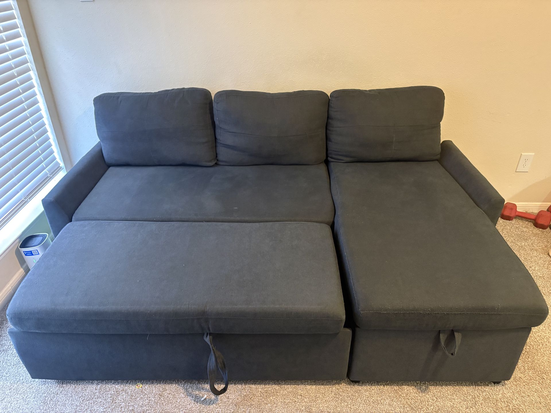 Modern sectional sofa with reversible chaise. Includes hidden storage compartment and pull-out sleeper bed. Clean, comfortable, and in good condition. Perfect for apartments or guest room. No major damage. Pickup only. Need pick up by march 12