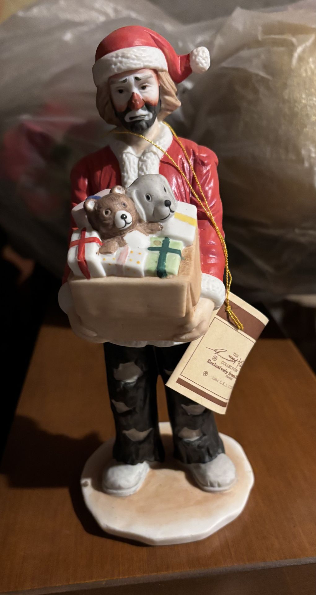 Emmett Kelly Jr collection, Santa Claus clown holding a box of gifts. Flambro figurine about 8 inches