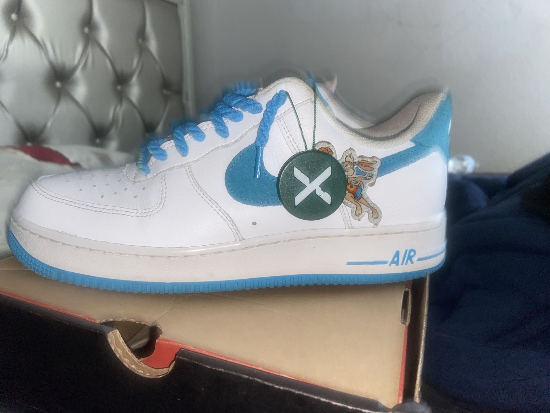 I switched the laces because they look good but if you want white i can give you an extra white one /I don’t have the box anymore but i do got other boxes of shoes/