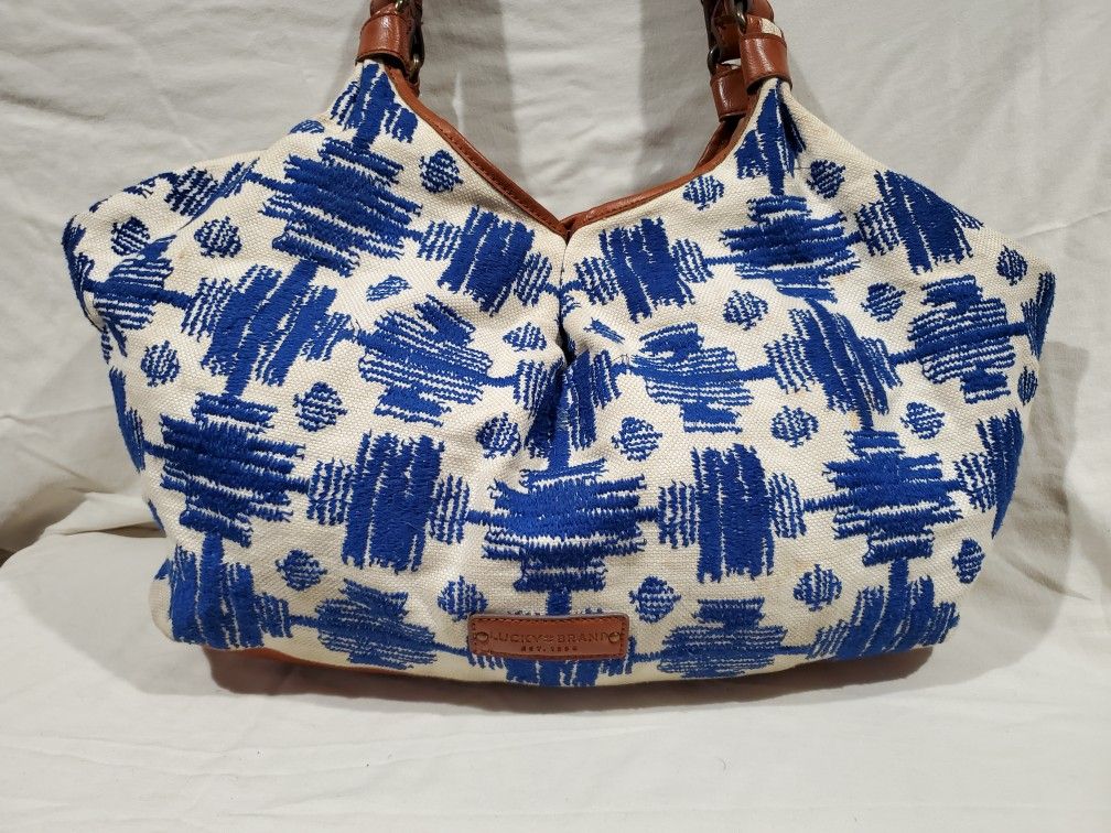 Large white and blue canvas Lucky Brand Majorca hobo bag with leather accents. Two large inside compartments with several small inside pockets. Leather bottom and handles with unique blue stitched pattern.
