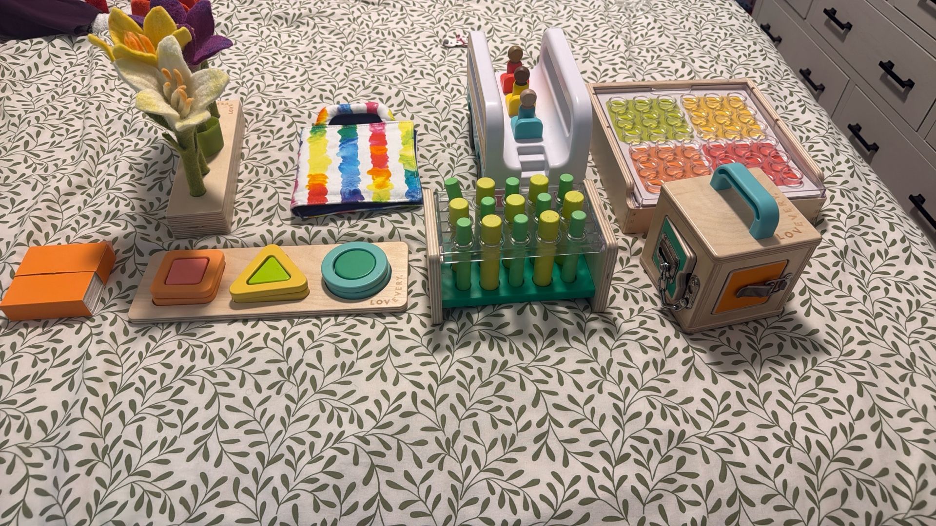 Toys from lovevery subscription boxes! Ranges from 19-27 months. Includes: Shape puzzle Bus with pegs Wooden peg with small and big shapes Color sorting activity with different patterns Lockbox that opens Portable paint markers with zip up case Action cards including 2 blank ones that can be written on