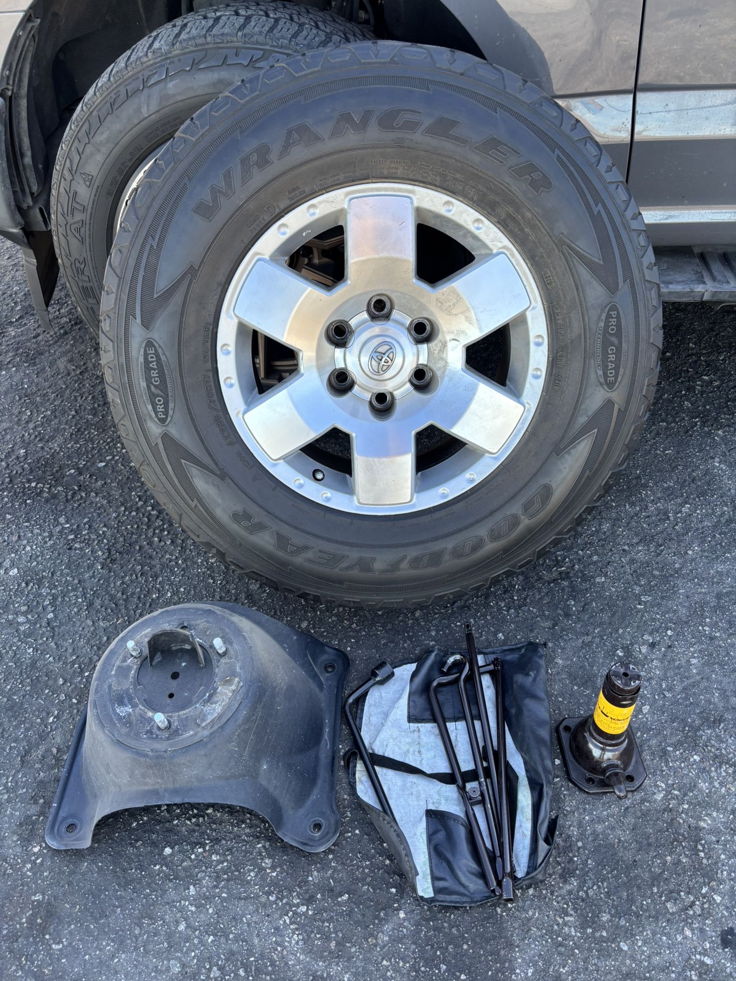 SE HABLA ESPAÑOL MESSAGE FOR PRICING AND AVAILABILITY EACH PART HAS DIFFERENT PRICING Toyota FJ cruiser spare tire kit 6 lug Spare tire and wheel Tire size LT 285/70R17 Genuine FJ Cruiser Rear Tailgate Spare Wheel Carrier Bracket Jack crowbar and lowering tools Come with their bag