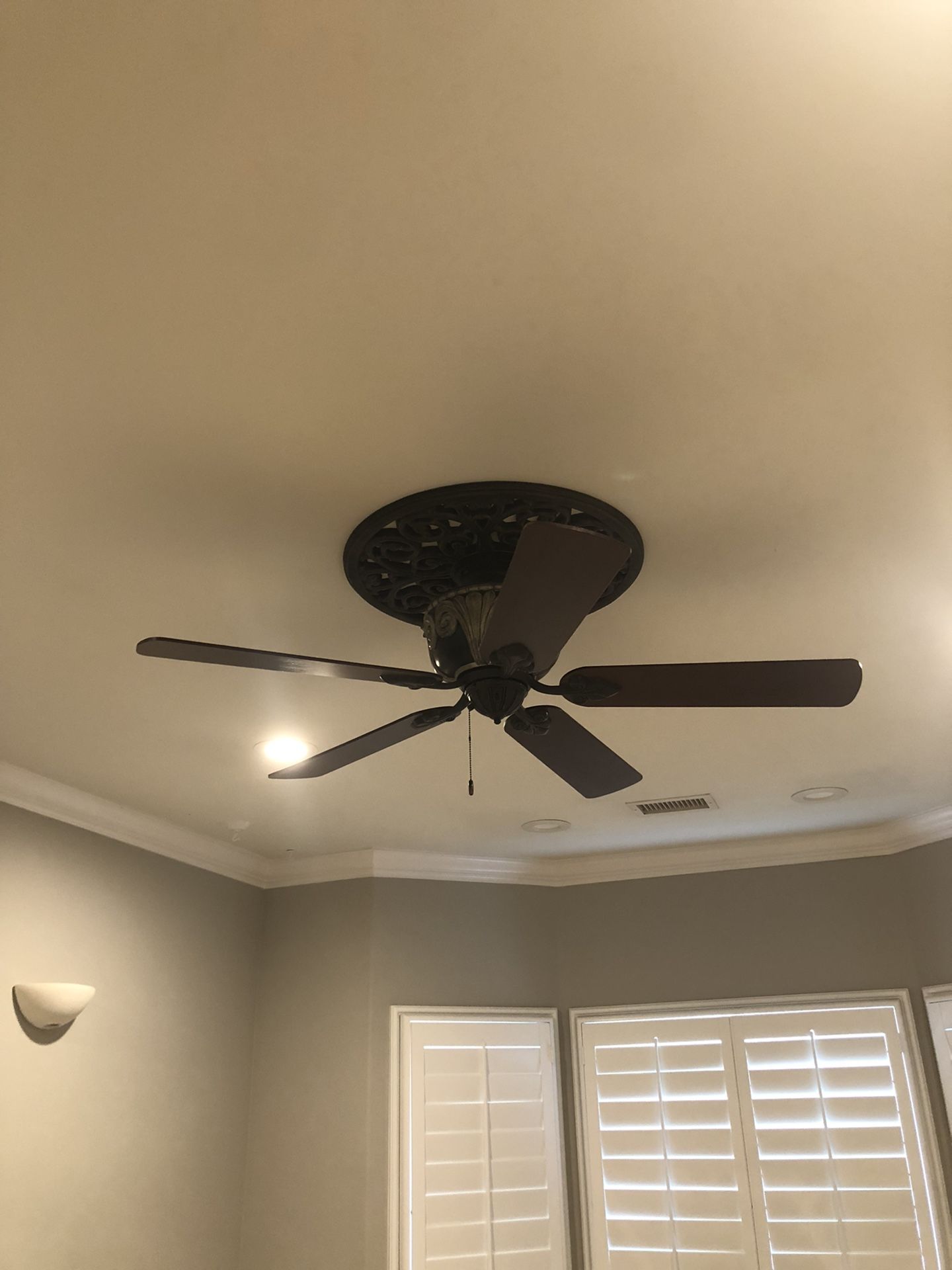 We moved into a home with this ceiling fan. Works perfectly but we are changing to a light instead of fan. This fan does not have a light. Ceiling plate and fan included.