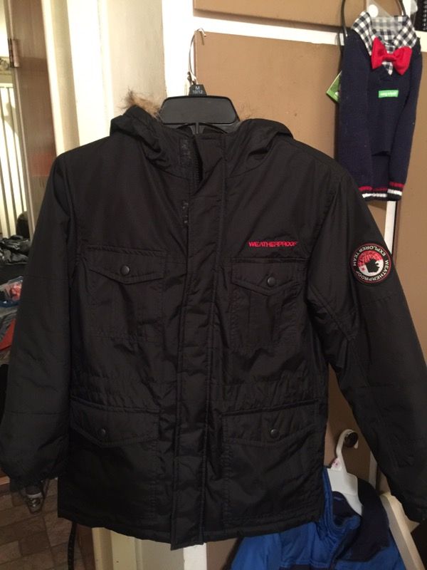 Weather proof boys med 8/10 WORN ONLY A COUPLE TIMES. Paid $55 selling for $15 firm. Selling because my grandson got caught in something at school and got two slits in the back as pictured. Otherwise a new super warm coat. Maybe an easy fix for someone who knows how.