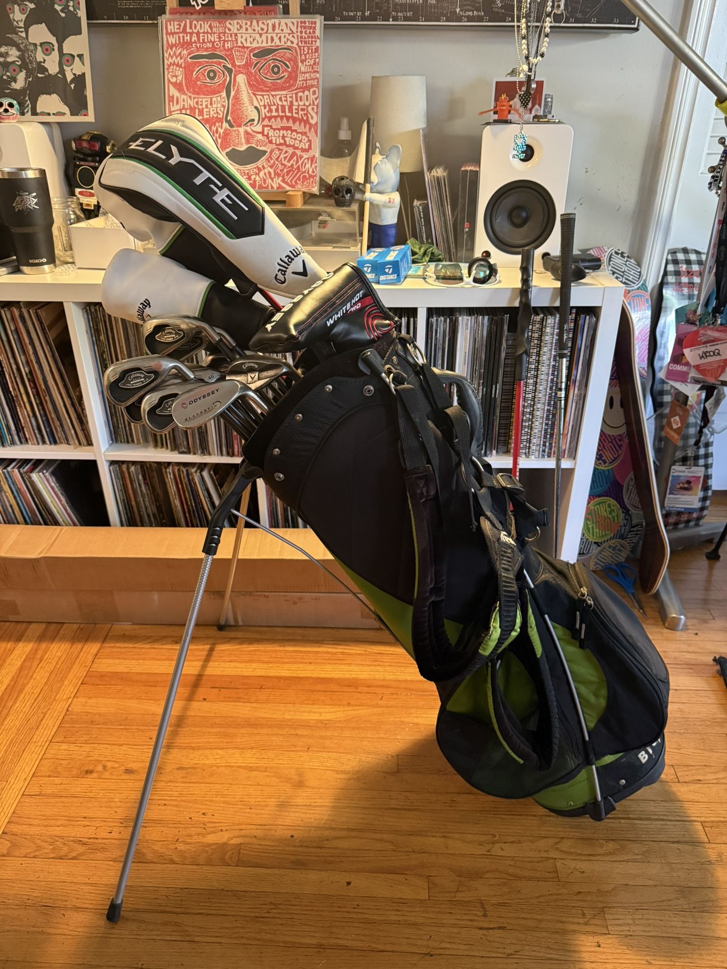 Callaway Steelhead X-16 Pro Irons / 3-PW / Graphite shafts Callaway X Series 54* SW Odyssey Blackspin 61* LW Callaway RAZR Fit Driver 10.5* Callaway RAZR X Black 3 & 5 woods Callaway Palomar Putter Callaway Big Bertha stand Bag Head covers for the driver, woods, and putter included $400 for everything Value Breakdown: Driver - $80 Woods - $140 Irons - $160 Wedges - $80 Putter - $50 Bag - $60 Total value: $550