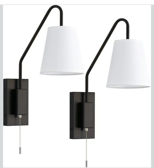 Terleenart Hardwired Sconce set of 2 with on/off Switch,Wired Bedside Wall Mounted Reading Lamps with Pull Chain Switch,Sloped Arm and White Fabric Shade BrandTERLEENART ColorBlack Light fixture formSconce Room TypeBathroom, Bedroom, Hallway, Kitchen Product Dimensions11.42"L x 6.3"W x 17.72"H Power SourceCorded Electric One set with 2 pcs.Dimension: Overall: 11.42" w x 17.72" h. Back Plate: 3.94" w x 7.08" h. Shade: 6.30" dia. Base Type: E26 socket.Voltage: 110V/120V.Accommodates dimmable LED bulb, Edison bulb,or Fluorescent (CFL),Incandescent, Halogen bulb (Max wattage: 60W). Note: bulbs are not included. This wall sconce has a pull chain, and the sloped neck on the sconce allows you to put in unique spaces like dormer nooks.The Pull chain on/off switches to control the lighting which are easy to control.