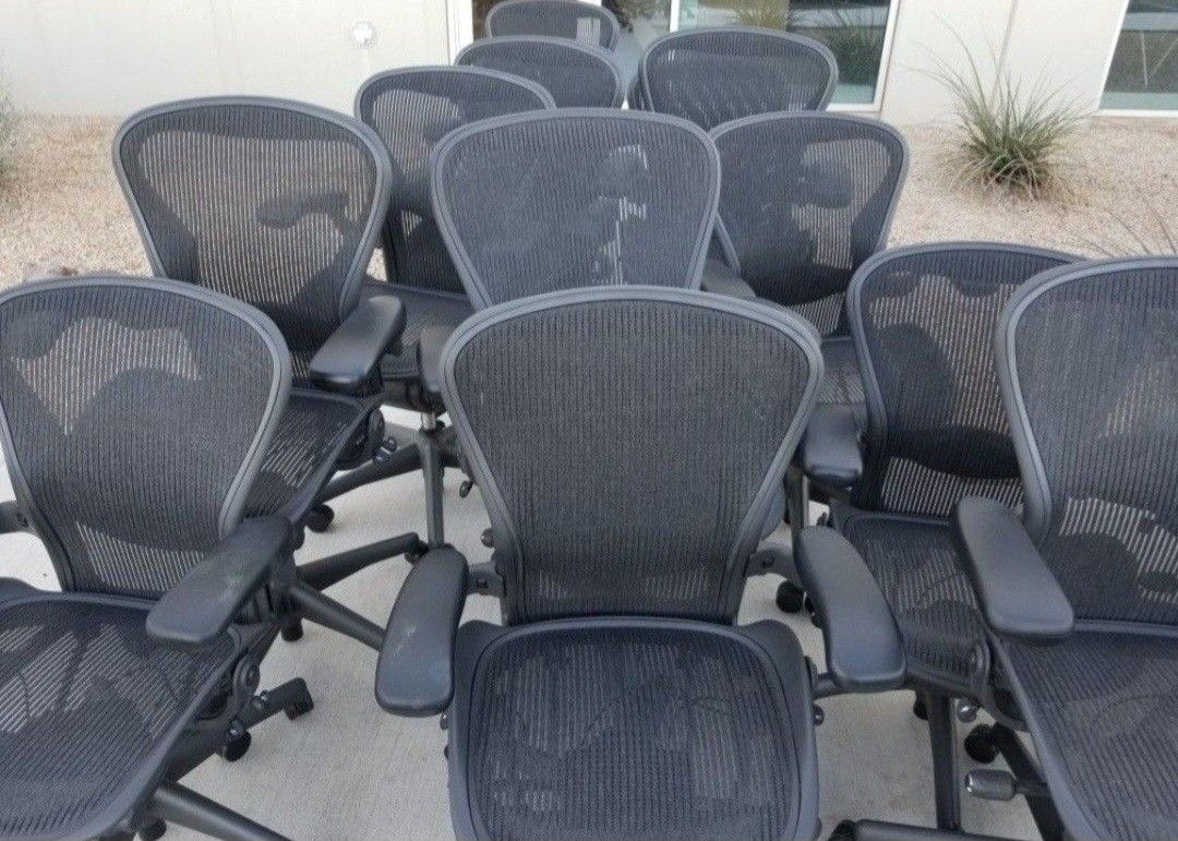 Newer Style Herman Miller Aeron Office Desk Chairs $350 Each Has posture fit lumbar support and lumbar pad options Has upgraded heavy duty pneumatic hydraulic cylinder which will last longer than normal hydraulics you can tell by the metal sheath around the post These are the cleanest and the best shape you can get being a classic Venmo, Zelle, Cash, CC, Cash App Size B These are newer style classics which means they have the clips for the adjustable arms. The older style have the wheels for the adjustable arms Free delivery within reason Fully loaded and just about perfect paint No blemishes or issues All mechanisms work perfectly