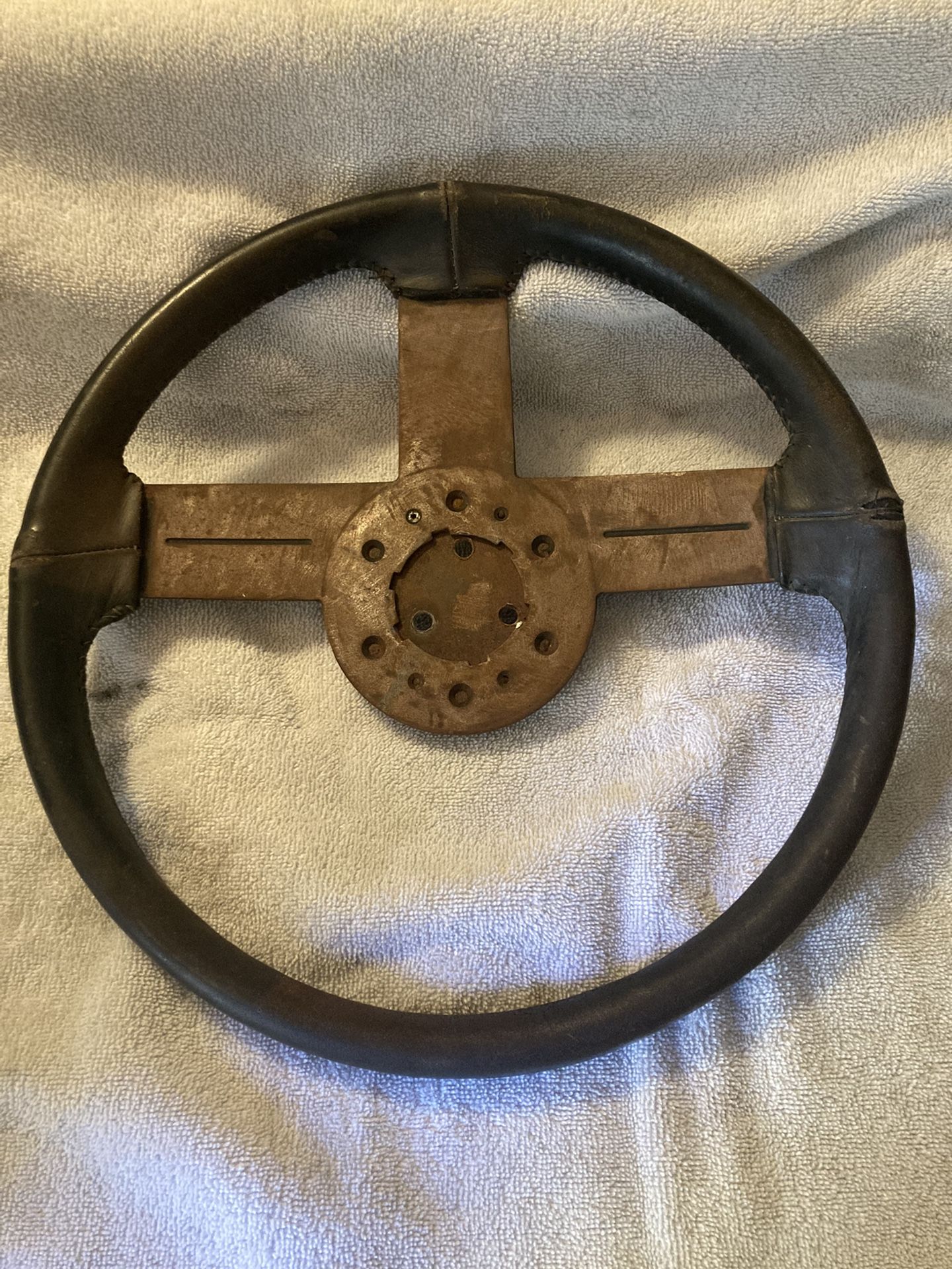 This is a vintage 14 inch wheel with great patina for a rat rod application, stitched leather binding with a 3 hole mount plate welded or re-drill for 6 hole mount, local pickup only, Menifee 92586