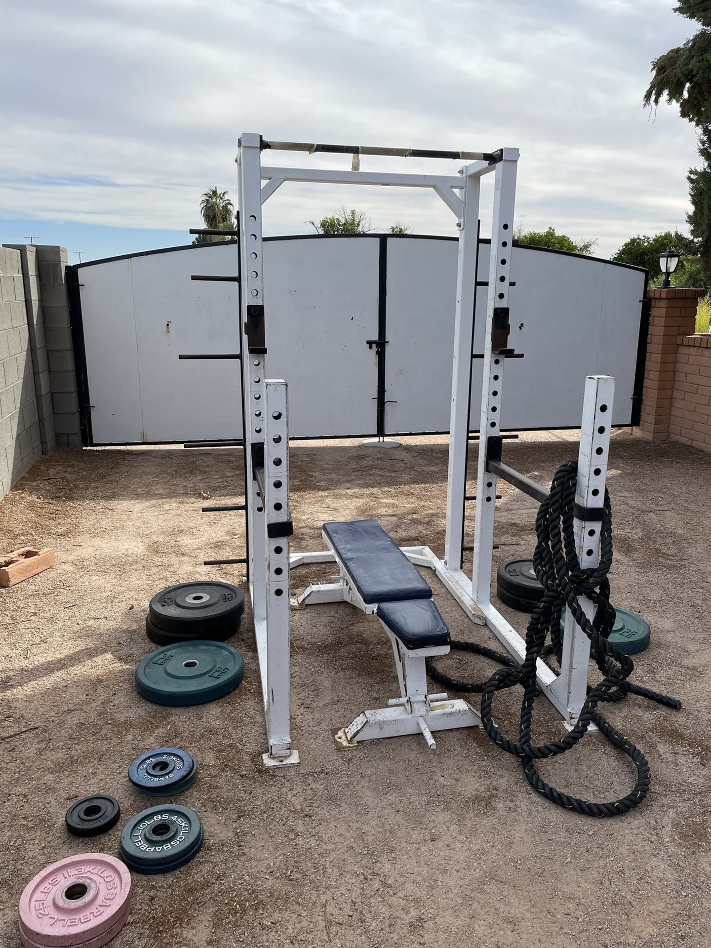 Cost $5,200 new Made out of high quality material 4” wide posts All heavy duty steel Solid bench 4 45 lb bumper plates 2 35 lb bumper plates 2 25 lb iron barbell plates 2 10 lb iron barbell plates 4 5 lb iron barbell plates 2 2.5 barbell plates Battle rope Setup cost $5,200 new All stored in storage but brought out to sell. Great condition