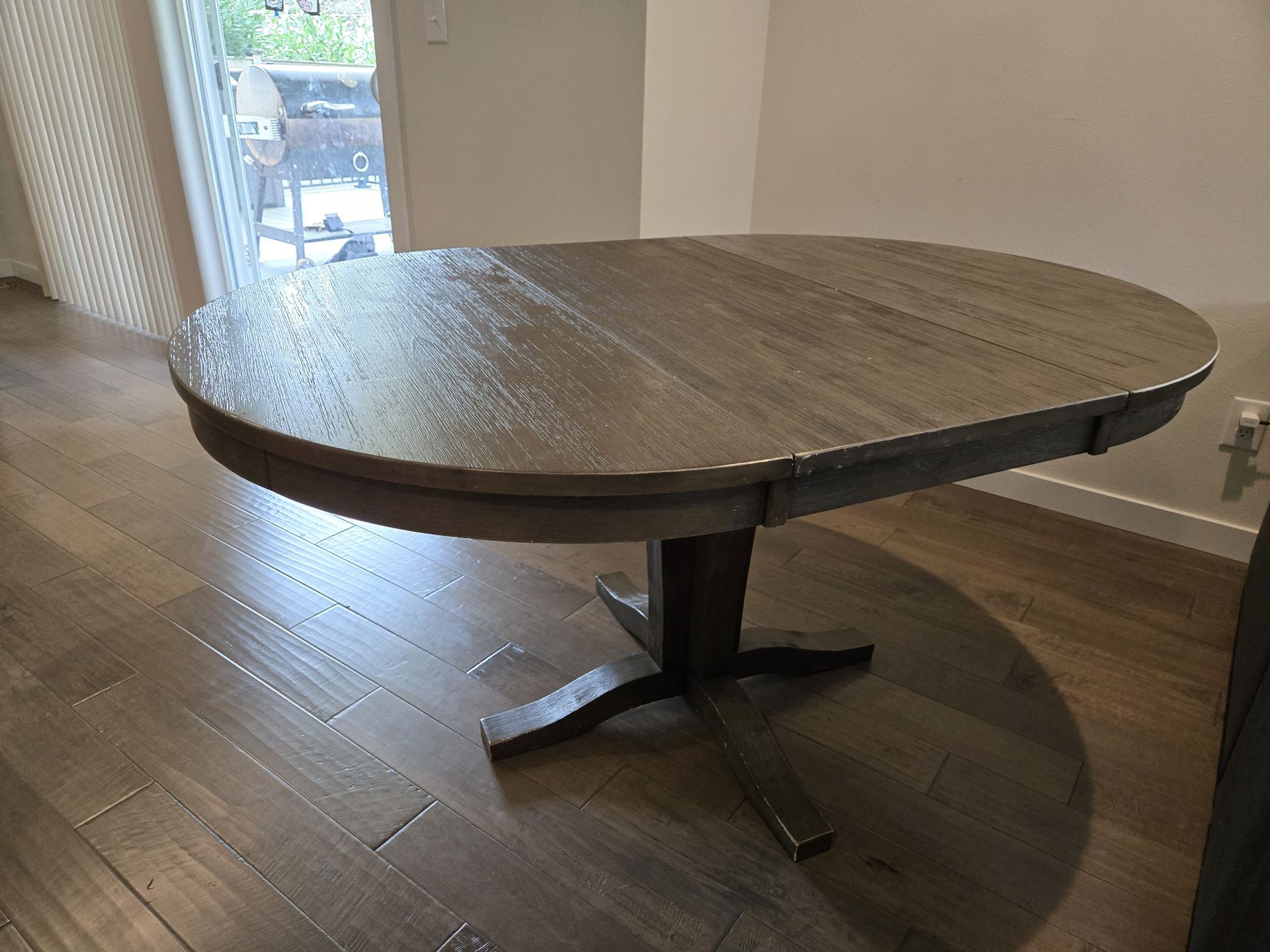 Round 42" or oval 60" with leaf. Great table! In decent condition!