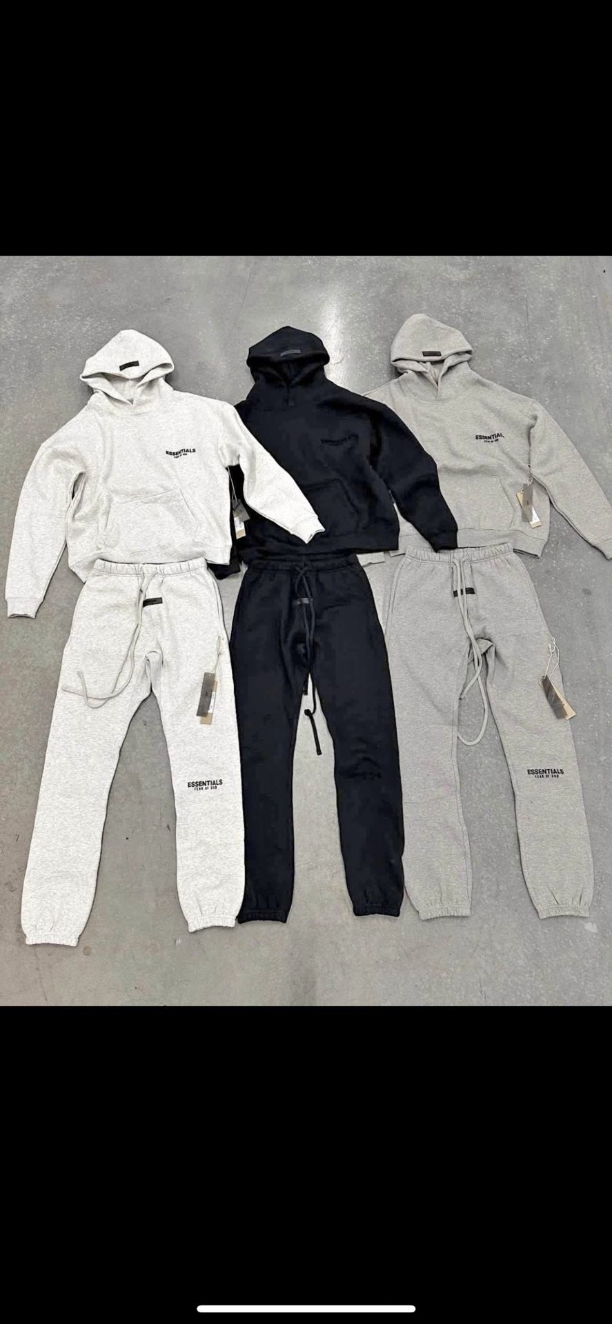 Fear of God Essentials hoodies and sweatpants available. All items are brand new and authentic. Colors available: • Dark Oatmeal • Light Oatmeal • Stretch Limo (deep charcoal/black tone)