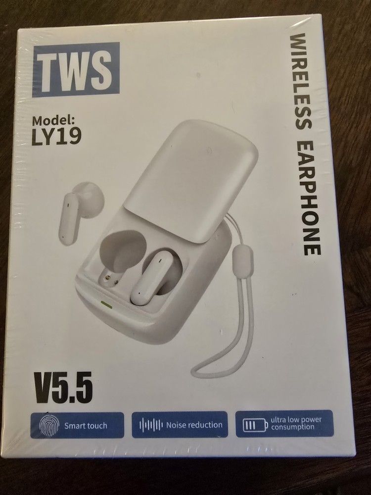 TWS LY19 wireless earphones. Connectivity: Bluetooth V5.5 Features: Smart touch control and noise reduction technology. Battery: Ultra-low power consumption. Design: White in-ear earbuds with a matching charging case. New in Box