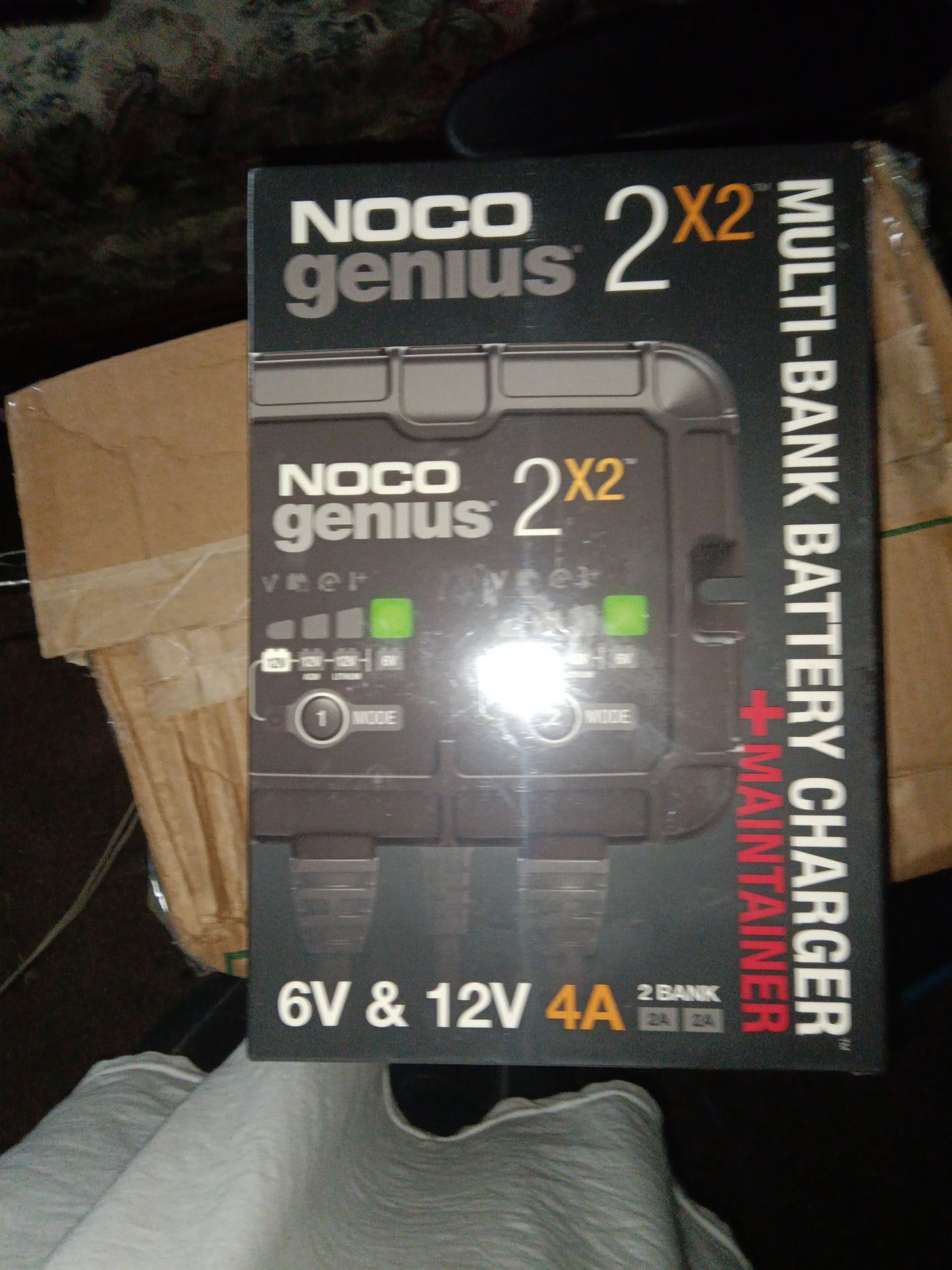 A two-bank battery charger maintainer rated a 4-amps - 2-amps per bank with a 40Ah capacity range - designed to charge and maintain multiple vehicles like cars, motorcycles, boats, ATVs, RVs, lawnmowers, lawn tractors, trucks, and more.
