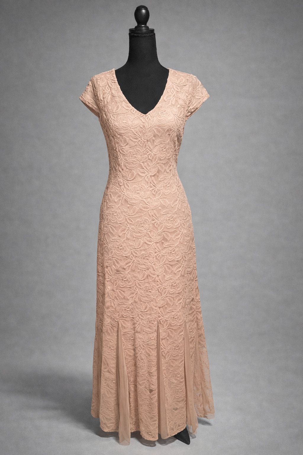 Elegant Candalite Petite lace overlay dress, perfect for special occasions or weddings. • Size: Petite X-Large • Color: Champagne / light bronze • Beautiful floral lace overlay with soft lining • Cap sleeves, V-neckline, and maxi length • Excellent pre-owned condition — no stains or snags Classic, flattering fit that moves beautifully in the light.