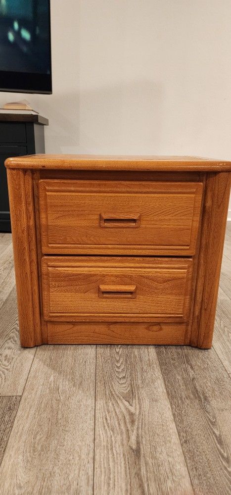 Light brown nightstand. I've had it about 10 years and it was in storage for about half that time. It has some wear and tear, mostly on the top finish but it's still solid. The drawers still work perfectly and are flush when closed. It's also fairly heavy. Cash only for payment. Dimensions: 22h x 24w x 16d