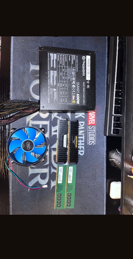 The image features several computer components, including a Thermaltake Smart 600W power supply. Power Supply: Thermaltake Smart 600W (PS-SPD-0600NPCWUS-W) is an ATX form factor unit with 80 PLUS Standard efficiency. Specifications: It features a single +12V rail, a 120mm cooling fan for quiet operation, and complies with Intel ATX 12V 2.3 standards. Included Items: The image also shows a CPU cooler and RAM modules, which are essential for assembling a PC. Protection: The power supply includes overvoltage, overpower, and short-circuit protection features.