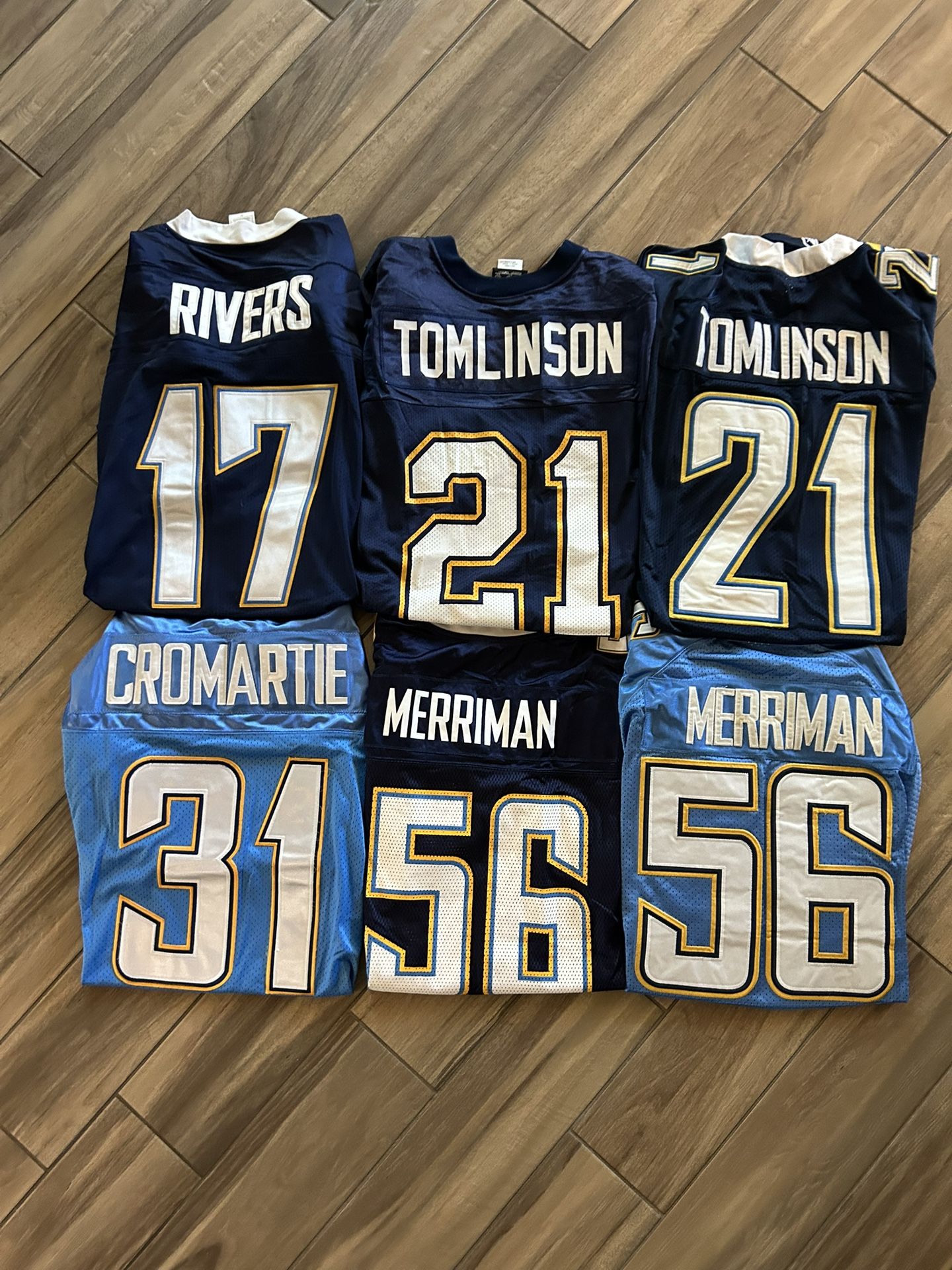 NWOT 2000s REEBOK AUTHENTIC SAN DEIGO CHARGERS EMBROIDERED JERSEYS SZ 54 & 56 All JERSEYS HAVE BEEN TRIED ON OR WORN ONCE 4 jerseys are stitch Antonio Cromartie Philip Rivers Ladainian Tomlinson Shawn Merrian 1 adidas early 2000’s LT non stitch jersey 1 Shawn merrian non stitch jersey